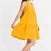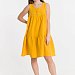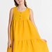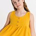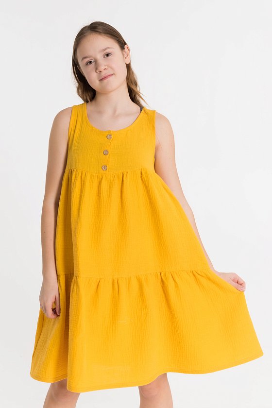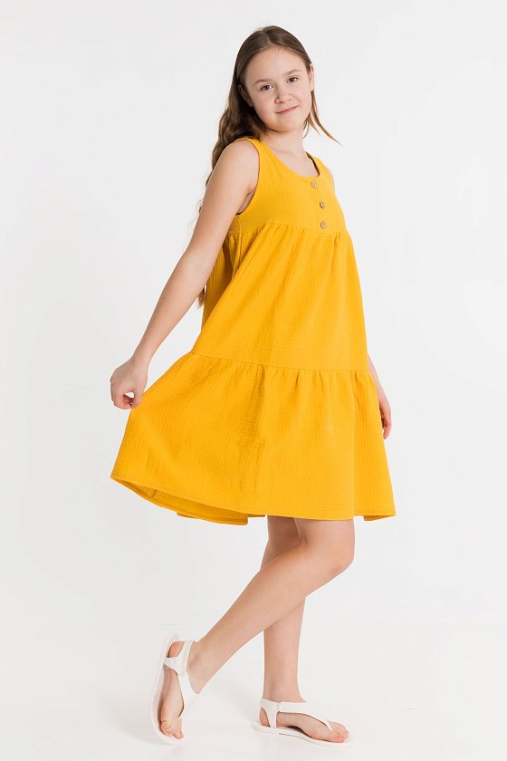 Сарафан для девочки выполнен из муслина. Пройма и горловина обработаны бейкой, спереди, на кокетках, оформлена ложная застежка.