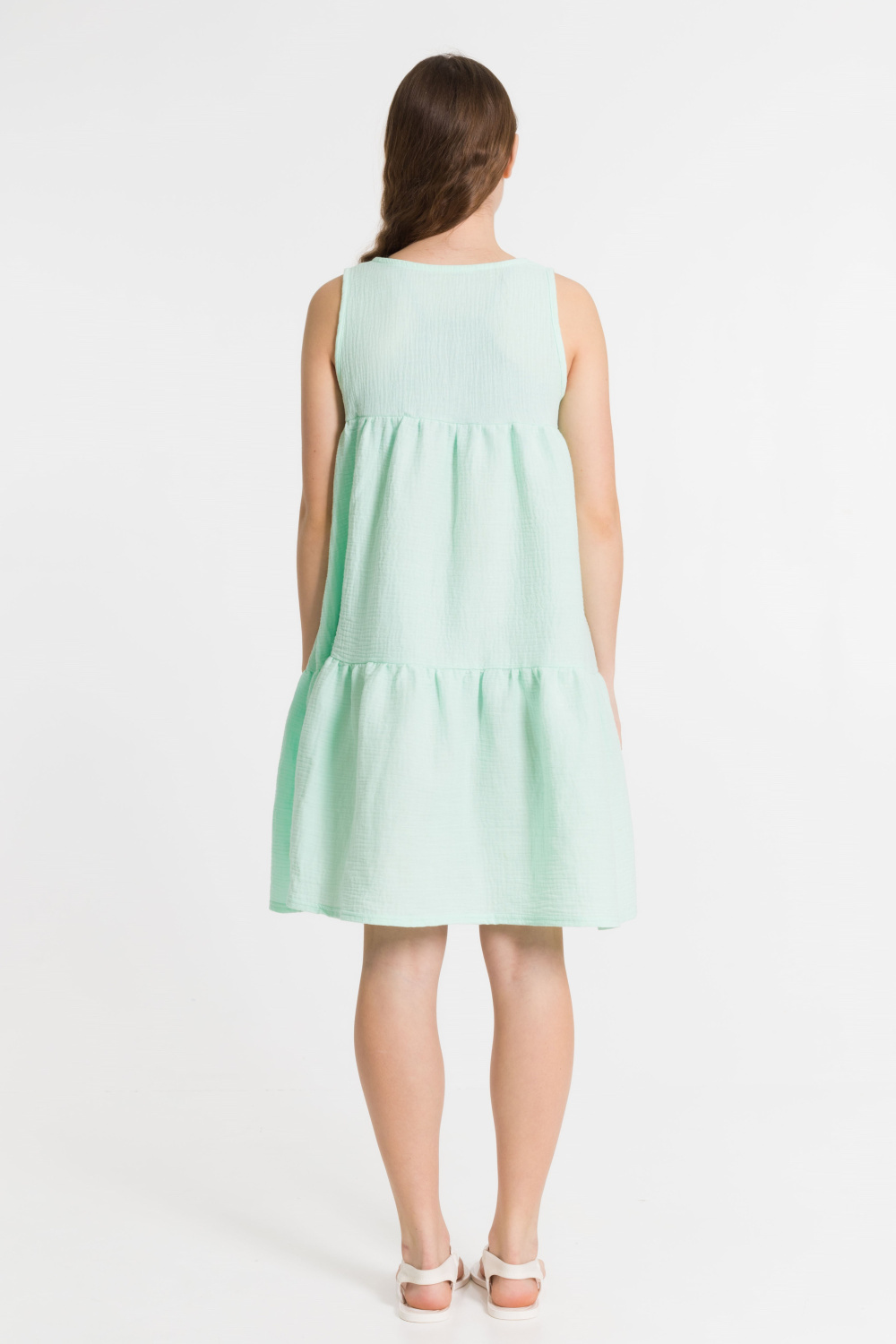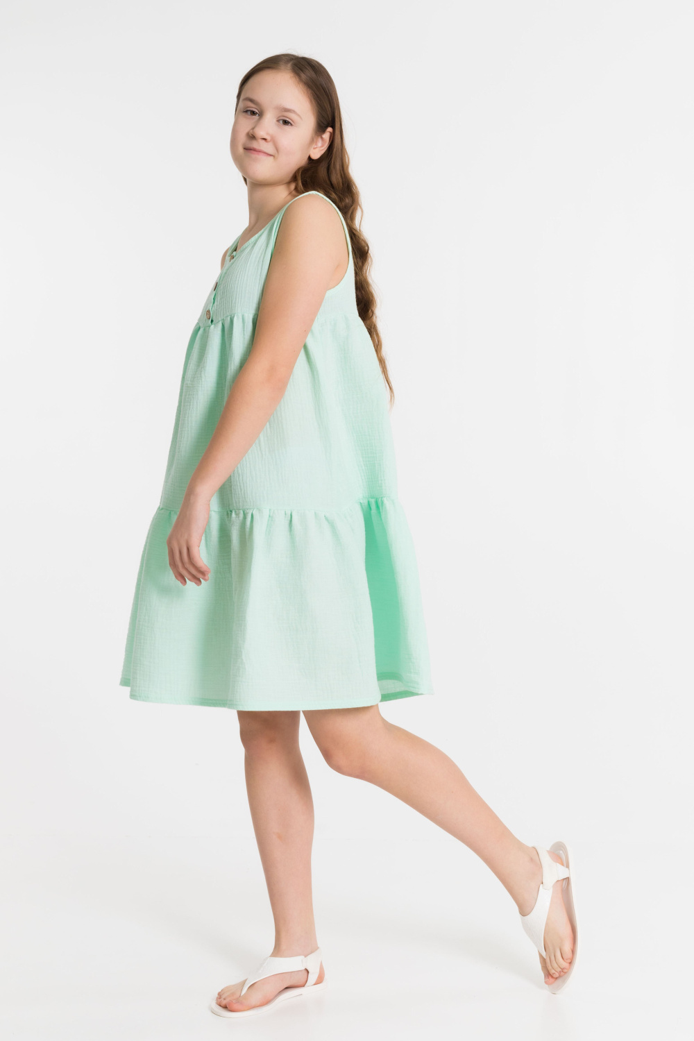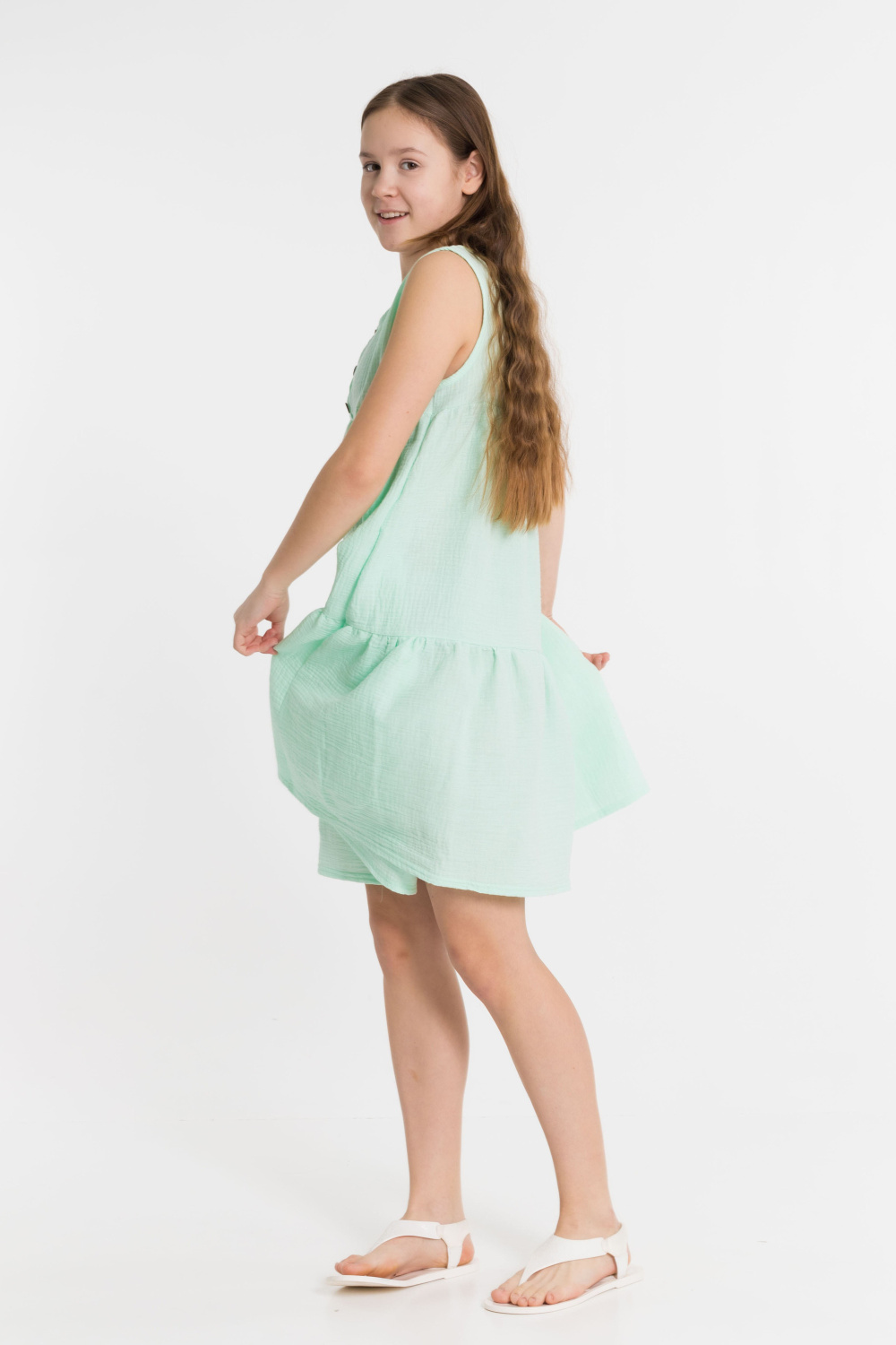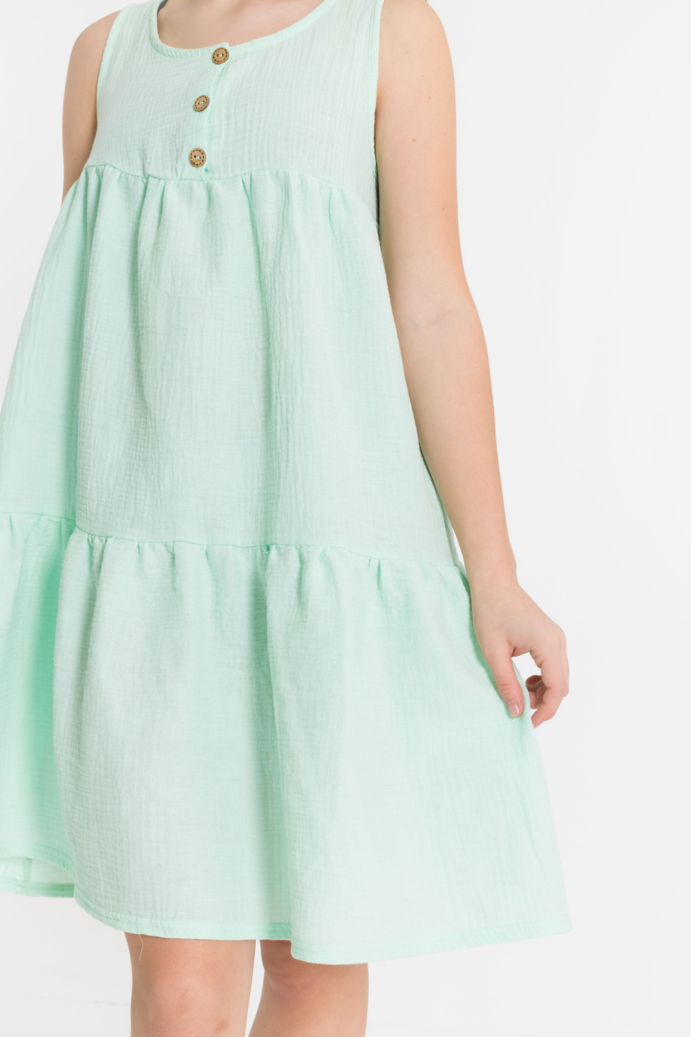 Сарафан для девочки выполнен из муслина. Пройма и горловина обработаны бейкой, спереди, на кокетках, оформлена ложная застежка.