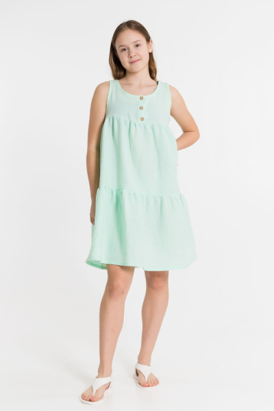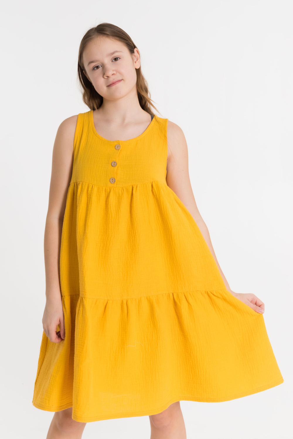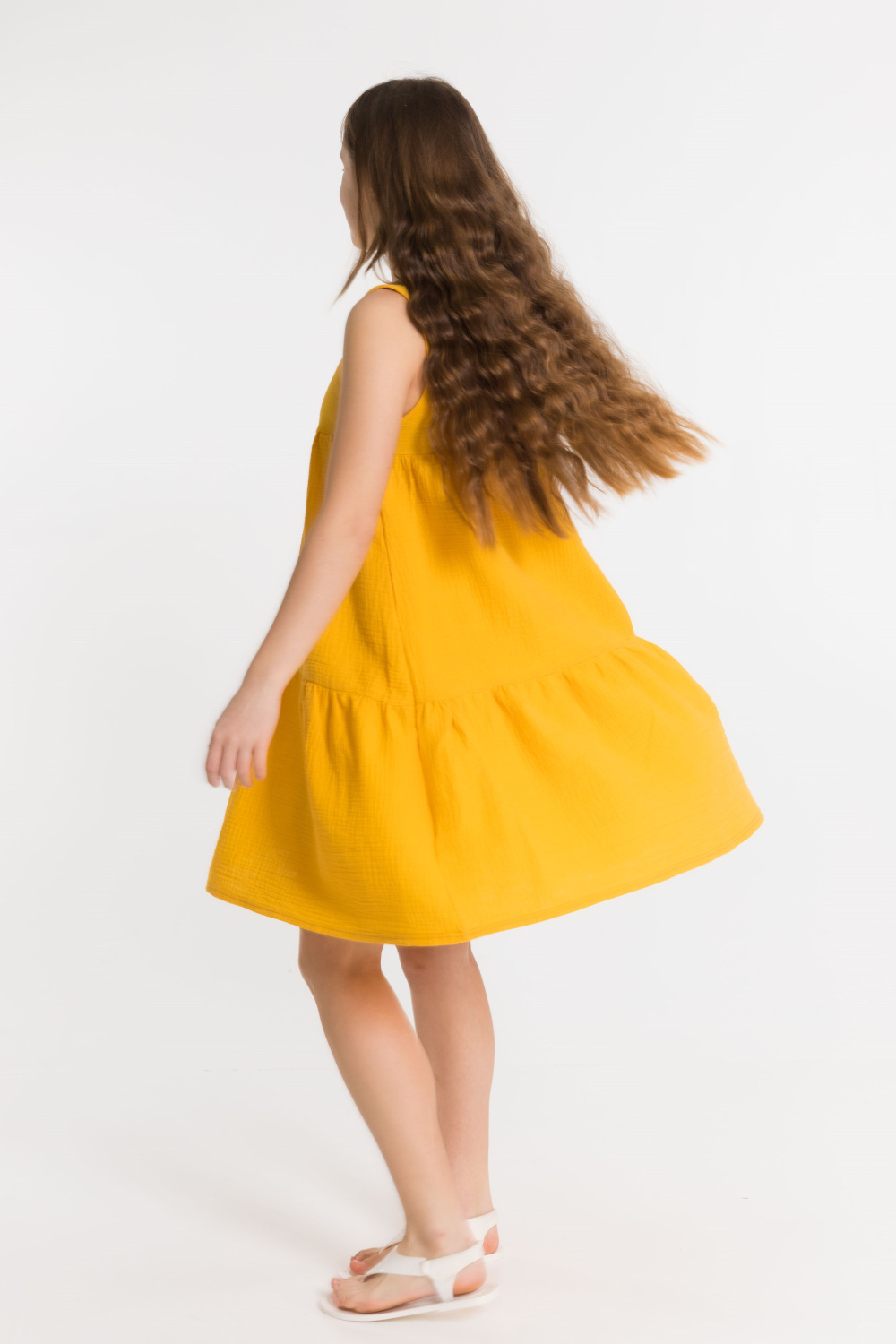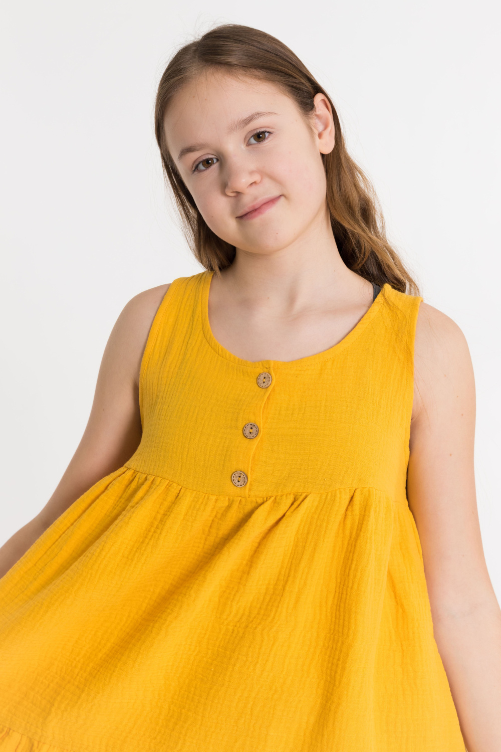 Сарафан для девочки выполнен из муслина. Пройма и горловина обработаны бейкой, спереди, на кокетках, оформлена ложная застежка.