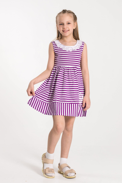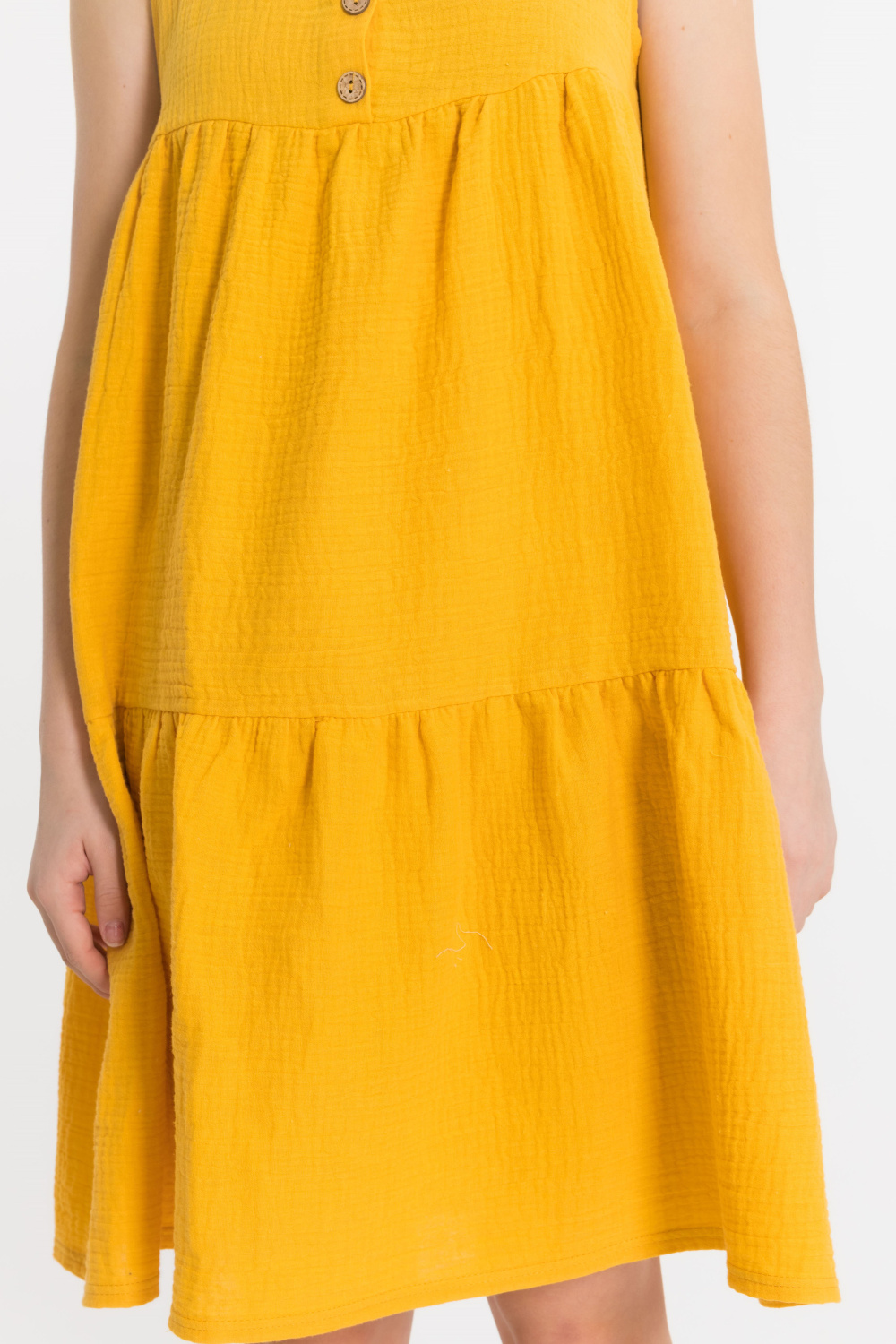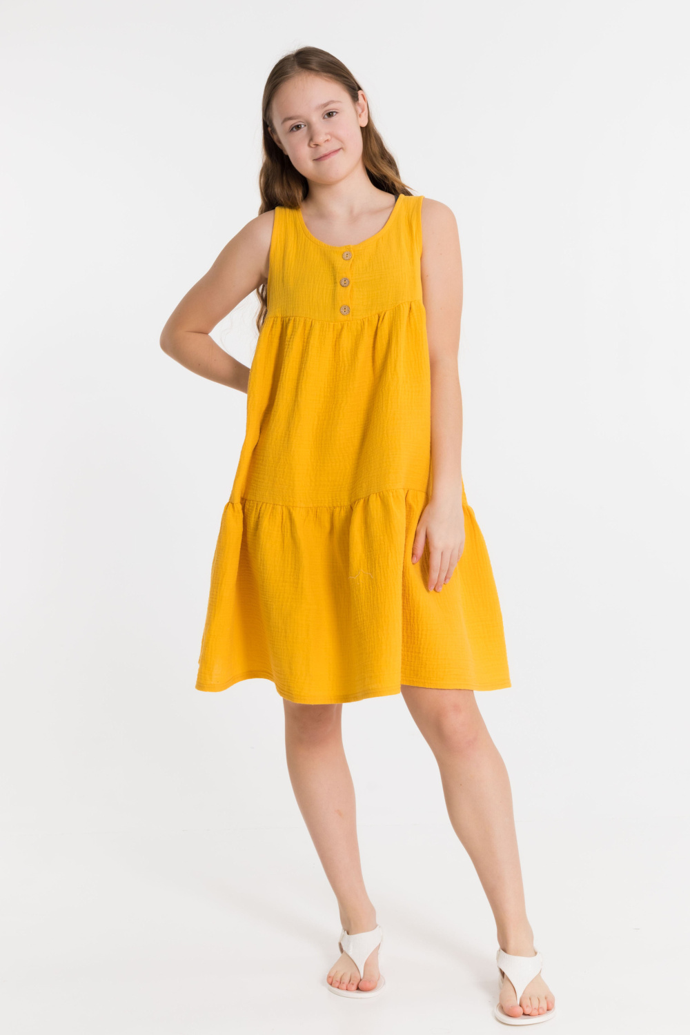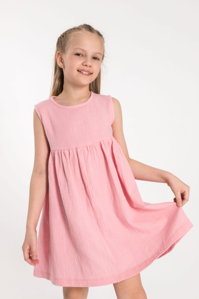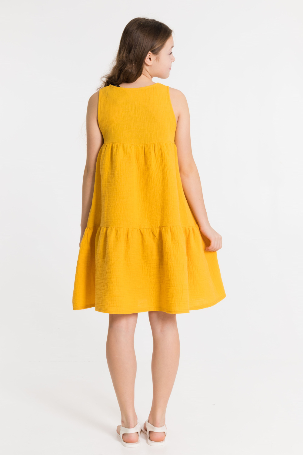 Сарафан для девочки выполнен из муслина. Пройма и горловина обработаны бейкой, спереди, на кокетках, оформлена ложная застежка.