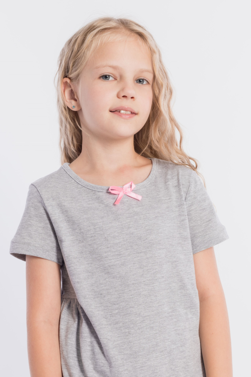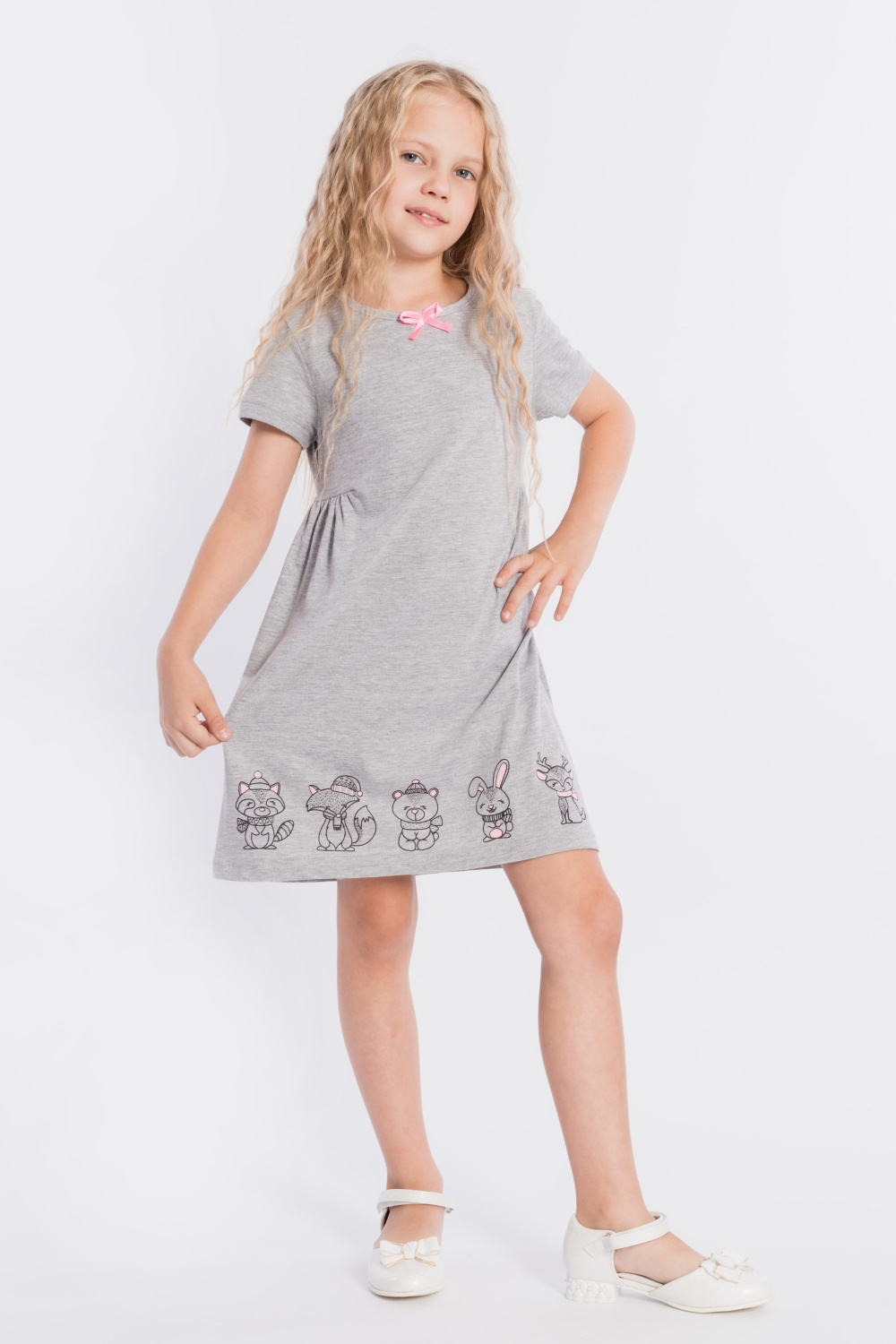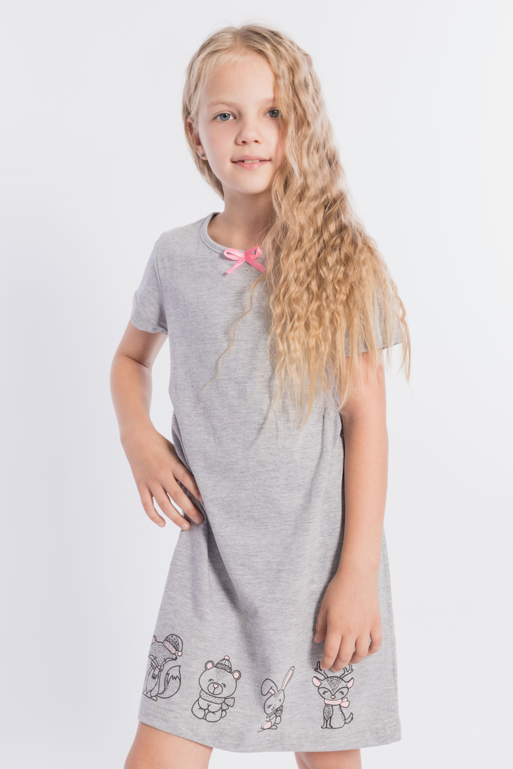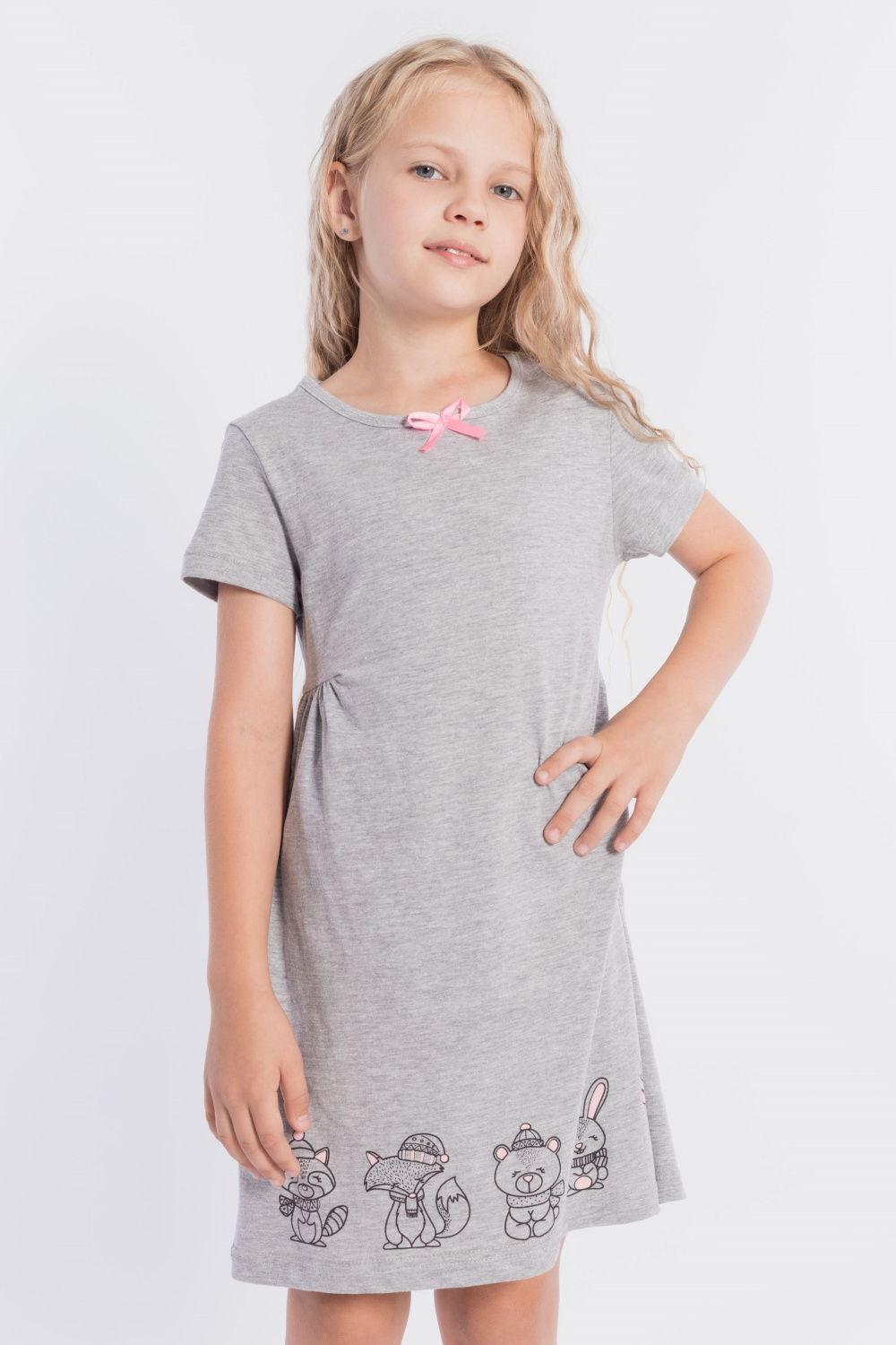 Платье выполнено из меланжевой кулирки, 100% хлопок. С коротким втачным рукавом, с подрезами на полочке и спинке, нижняя часть подрезов со сборкой. Спереди нанесён принт. На горловине расположен декоративный бантик.