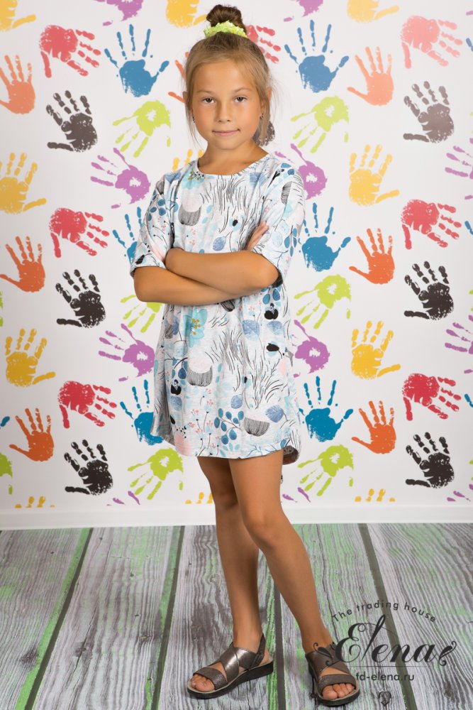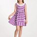 Платье из кулирки в мелкую полоску. Без рукавов, с отрезной юбкой на сборку. На спине застежка на кнопки. Горловина отделана кружевом. На юбке отделочная полоса и принт.