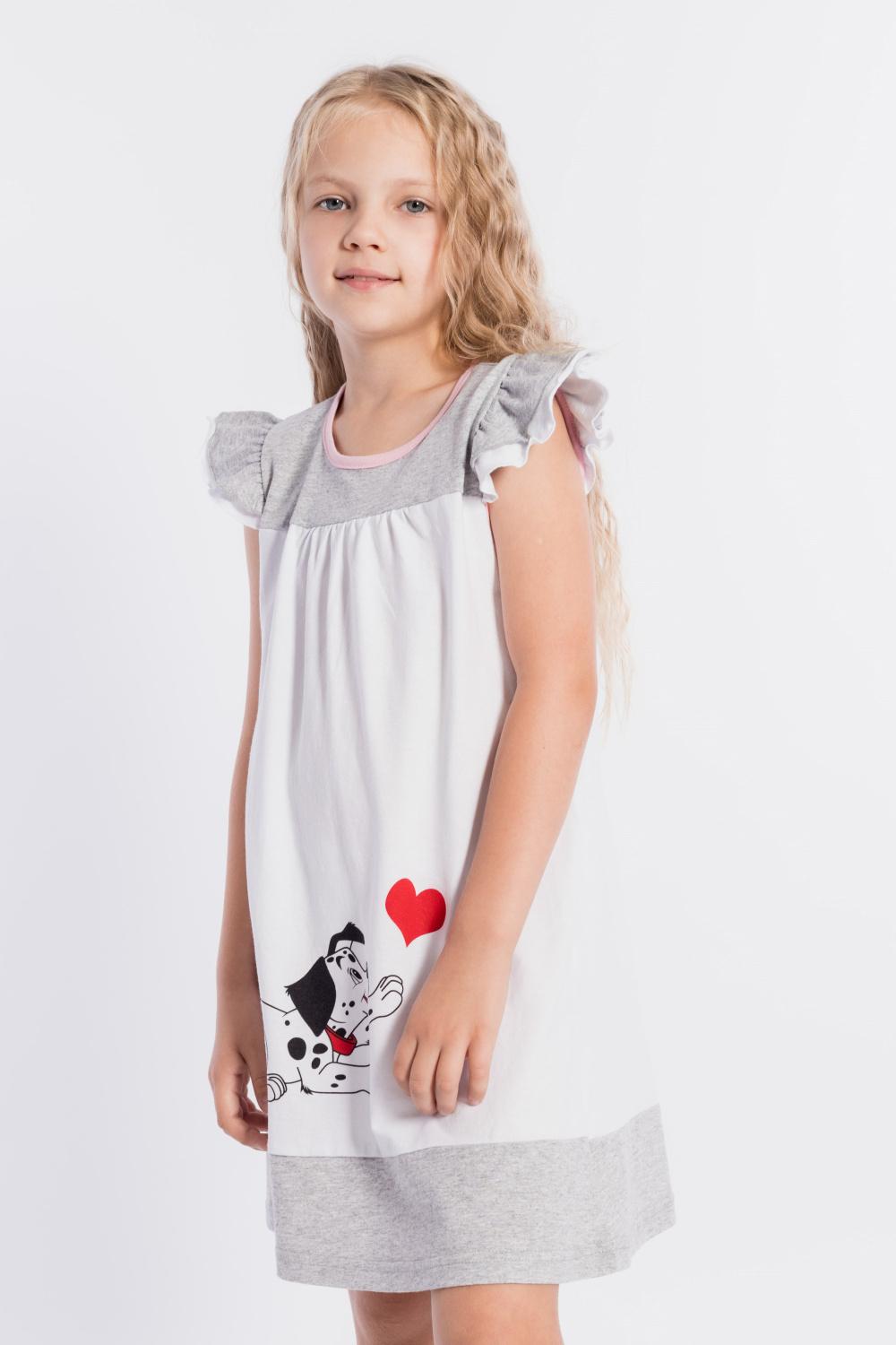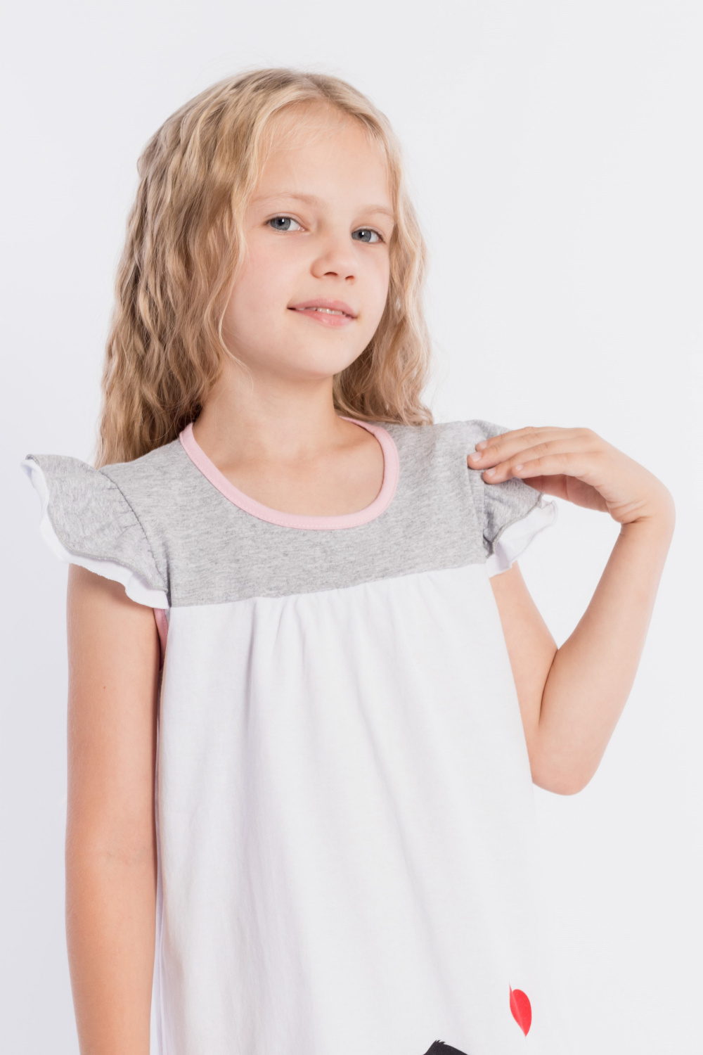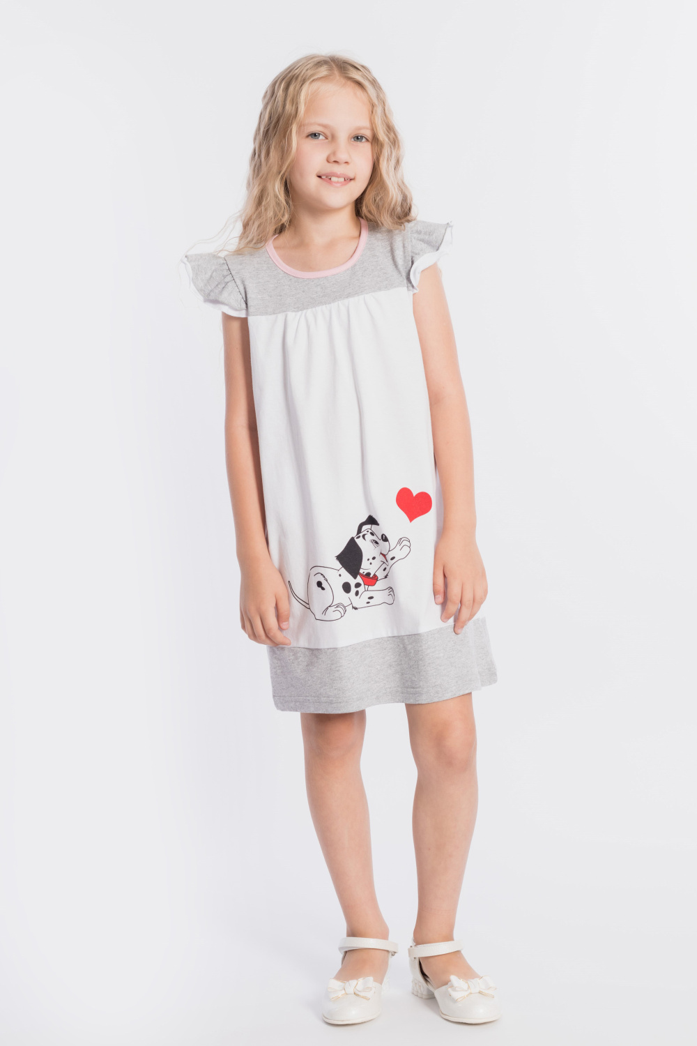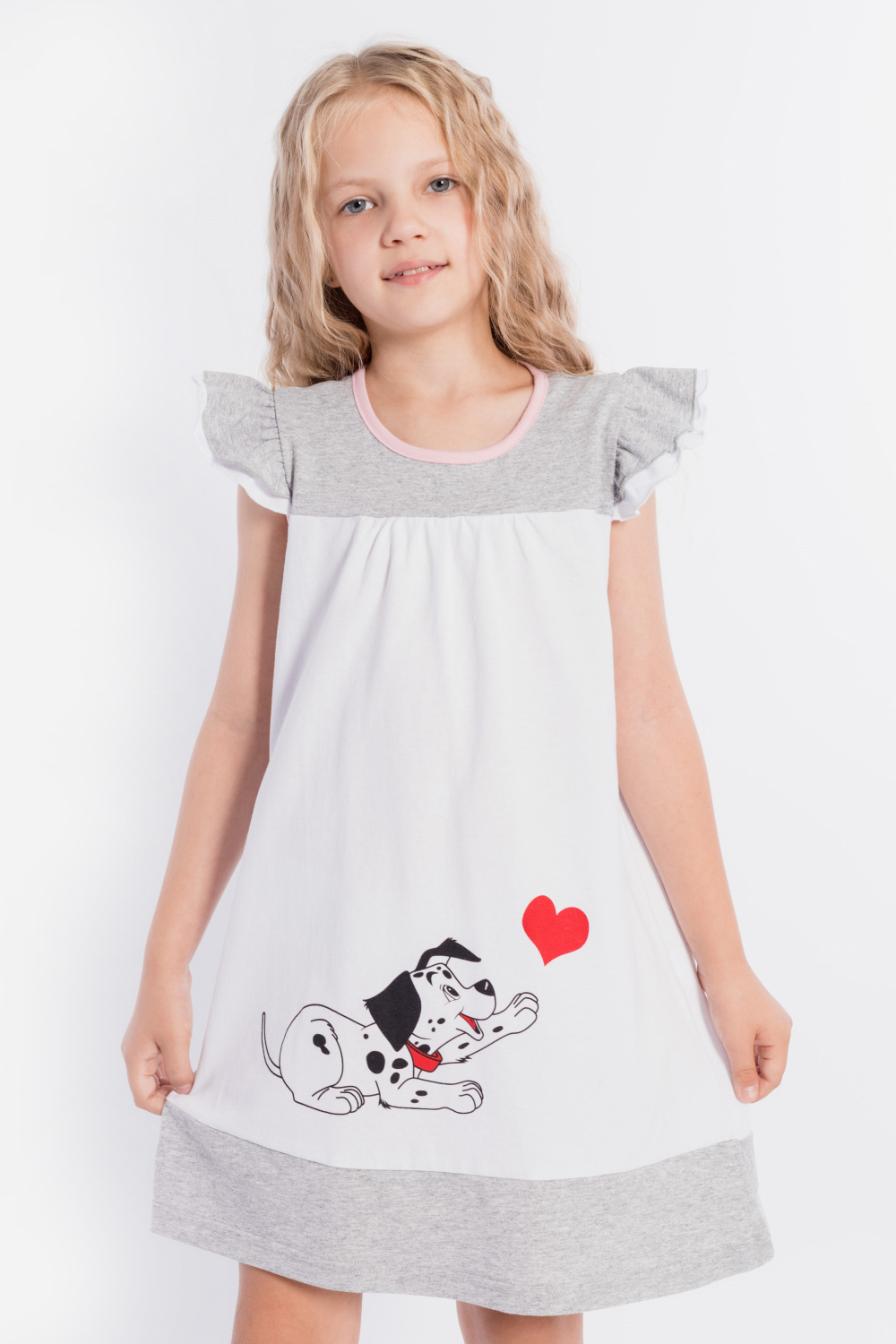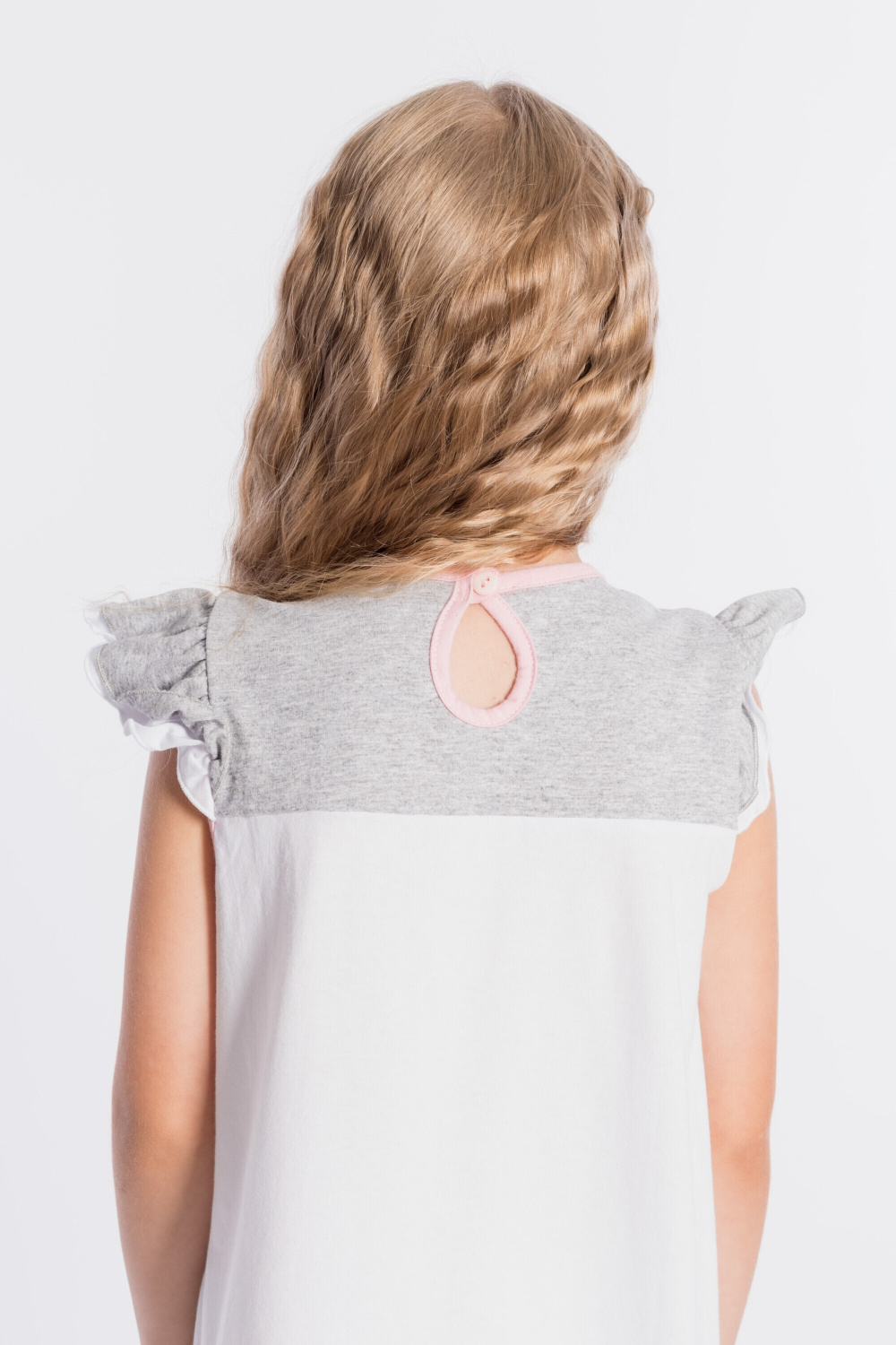 Платье выполнено из хлопкового полотна двух цветов. Спереди нанесен красивый принт. Двойные крылышки так же являются украшением платья, горловина и проймы обработаны бейкой. Сзади декоративный вырез и застёжка на пуговицу.