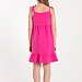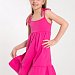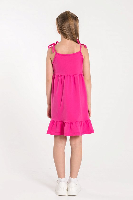 Летний сарафан для девочек с завязывающимися бретелями выполнен из кулирки. К лифу притачана юбка с широкой оборкой по низу.