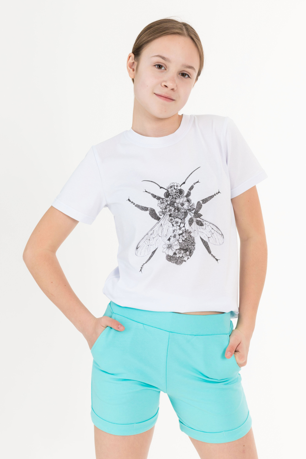 Шорты выполнены из однотонного футера с лайкрой. Шорты с боковыми карманами и притачным поясом на резинке, низ оформлен отворотами.