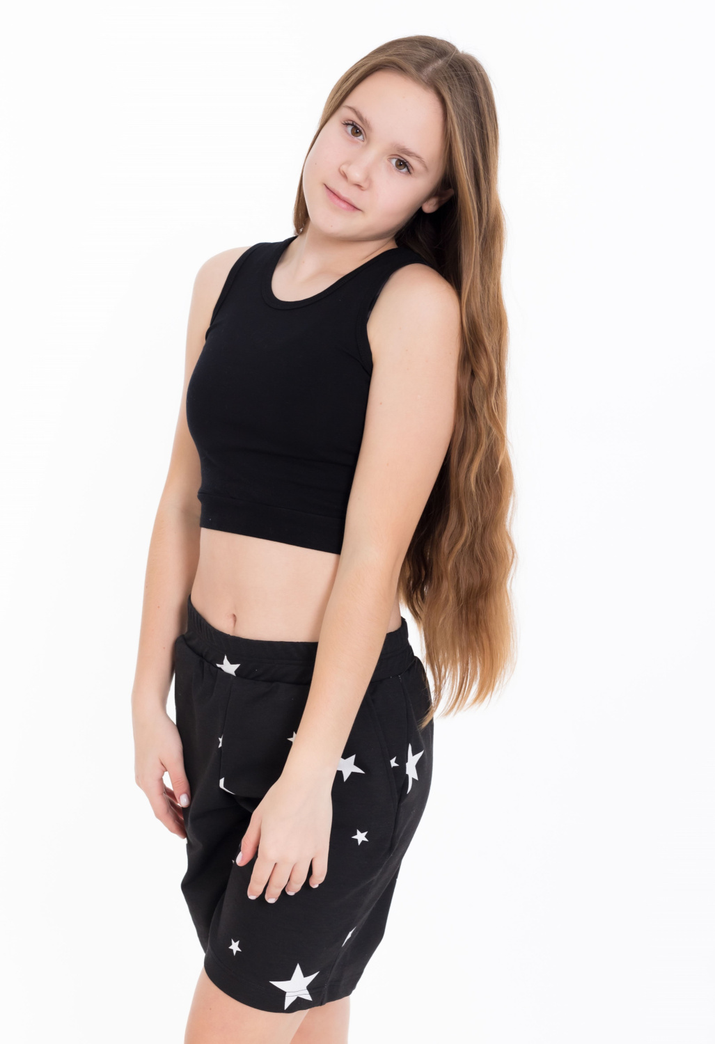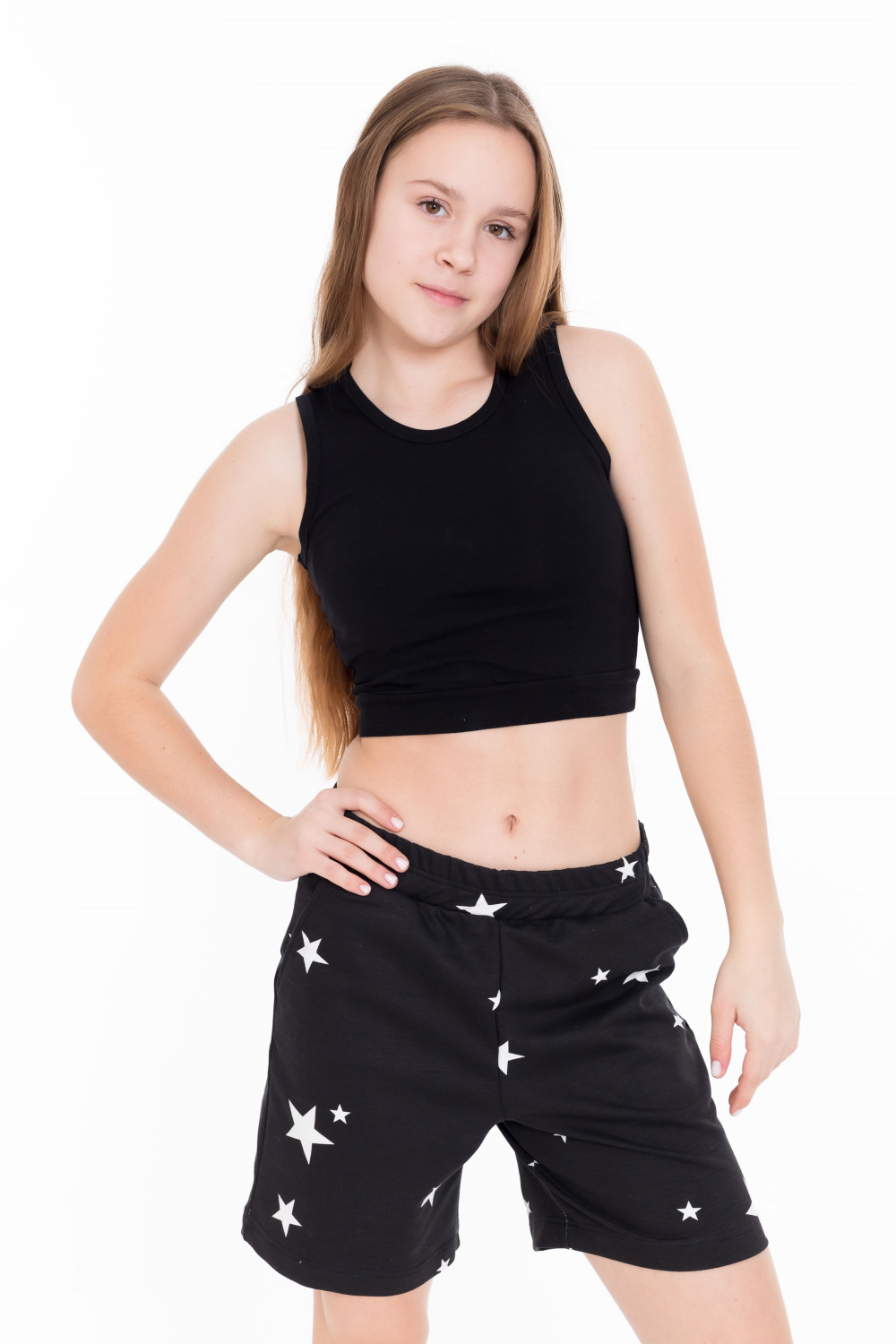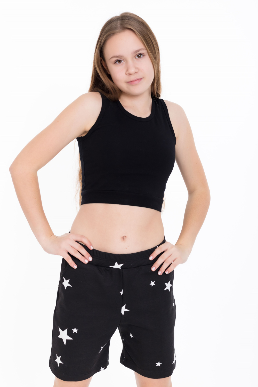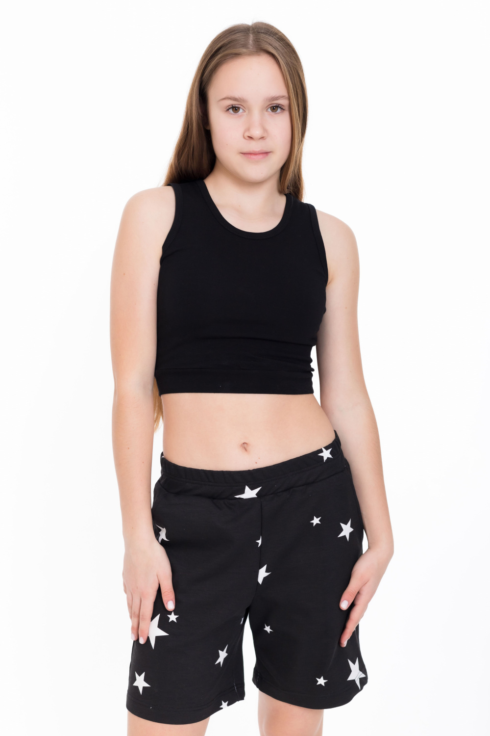 Шорты для девочки из футера с лайкрой черного цвета с набивным рисунком звезды - стильно и удобно. Слегка расширенный крой придает шортам комфорт и свободу движений. Боковые карманы добавляют практичности и удобства, позволяя хранить мелочи или просто расслабить руки. Притачной пояс обеспечивает комфортную посадку, а наличие лайкры в составе ткани обеспечит эластичность и легкость в движении. Набивной рисунок звезды придает шортам интересный и яркий вид.