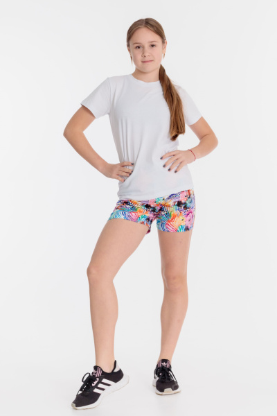 Шорты из футер петли с набивным рисунком. В боковых швах расположены карманы, пояс с резиной внутри.