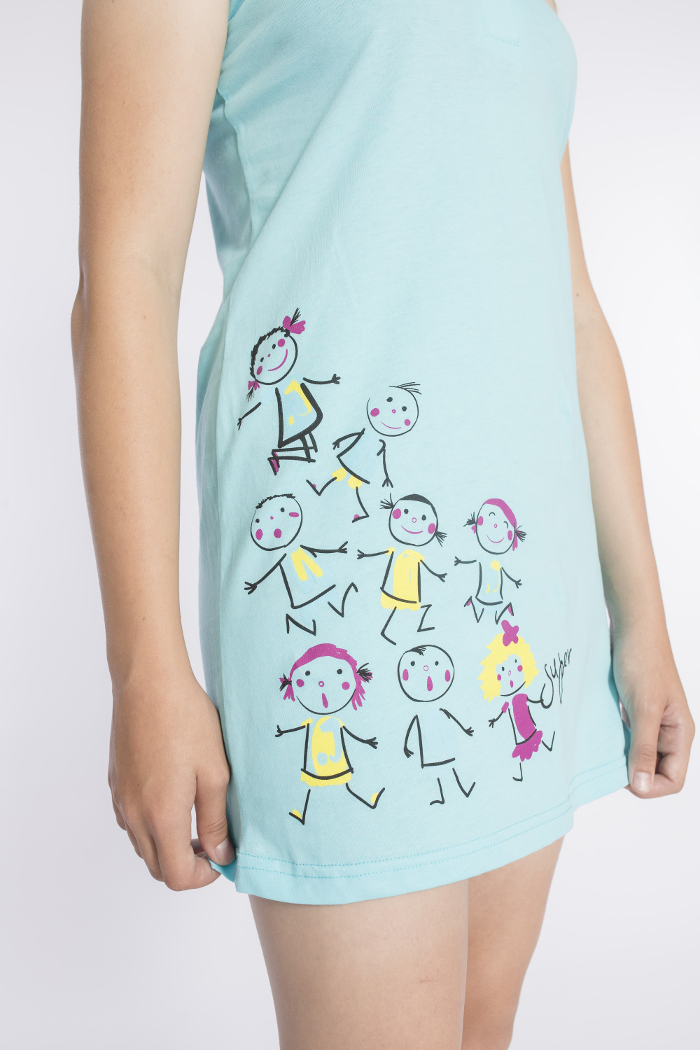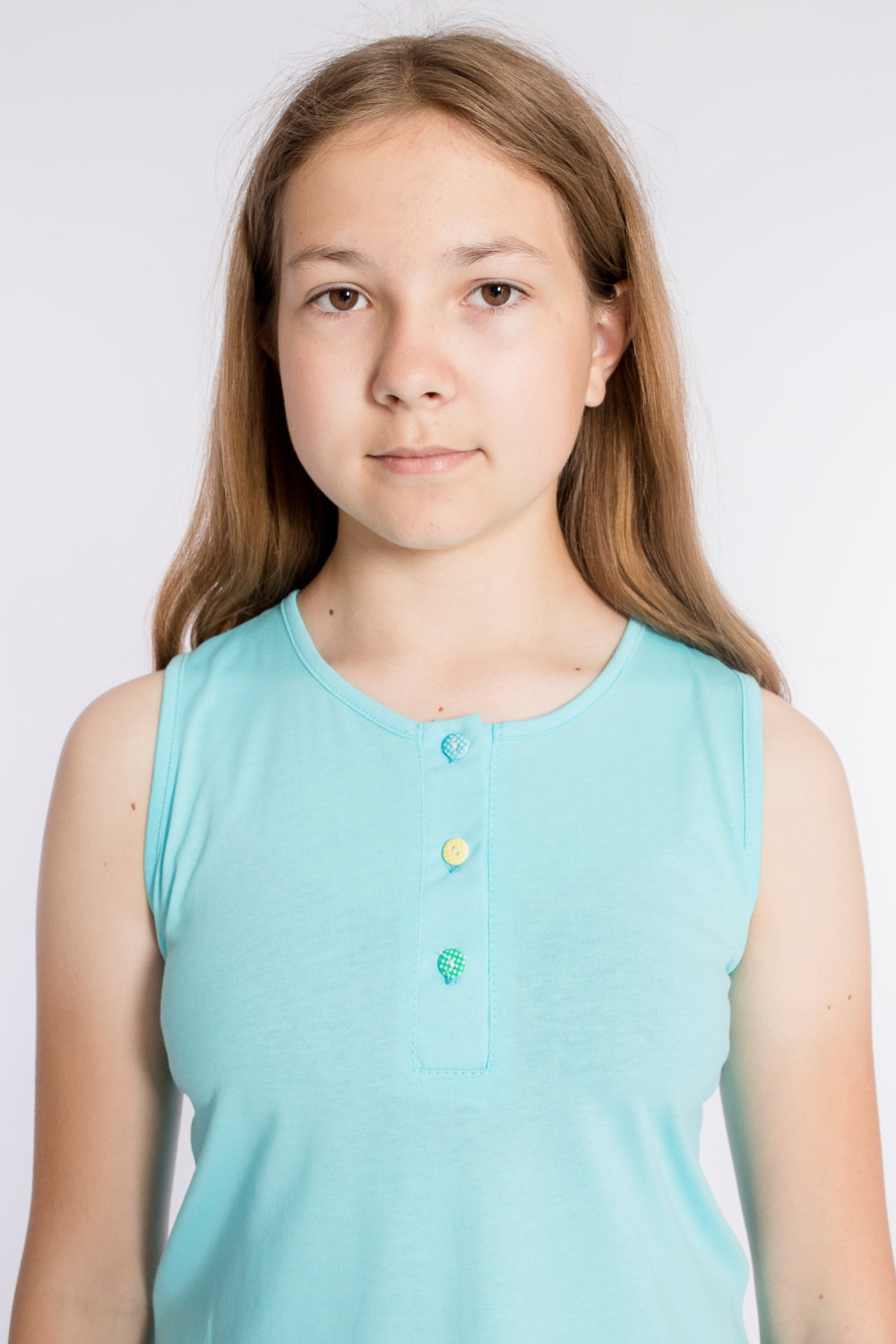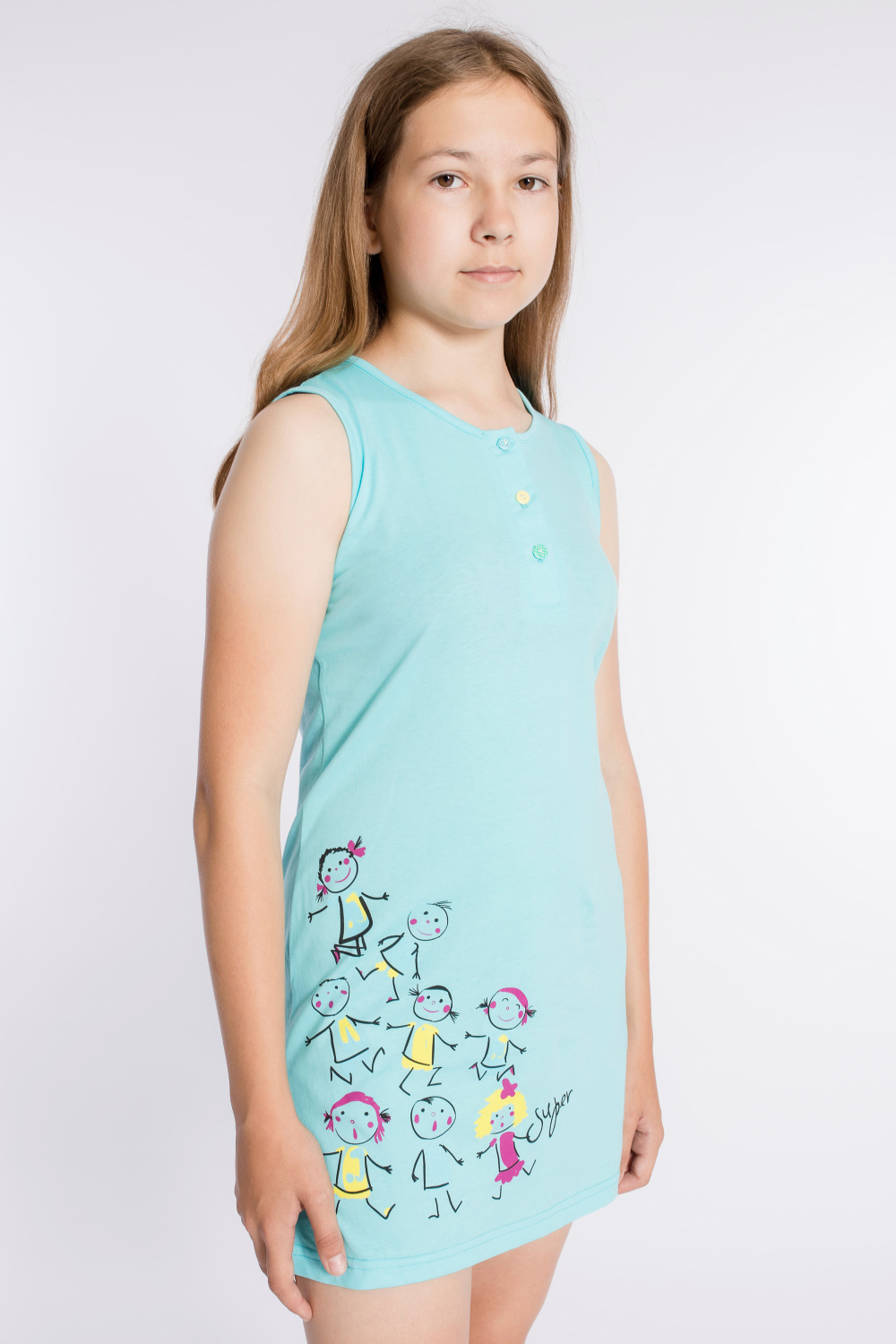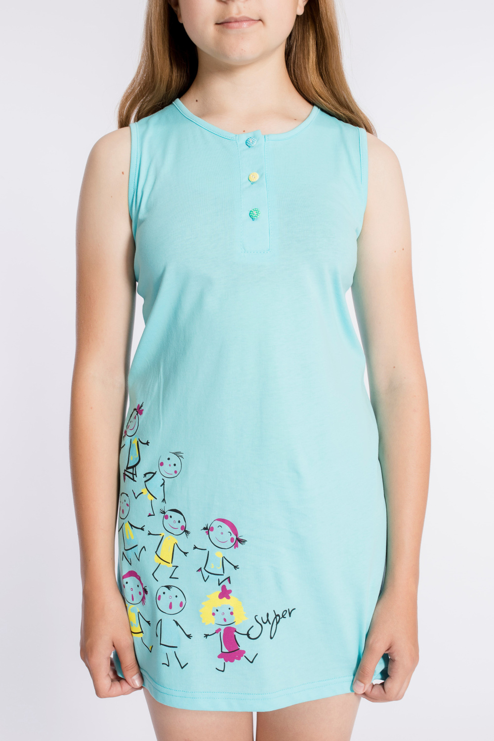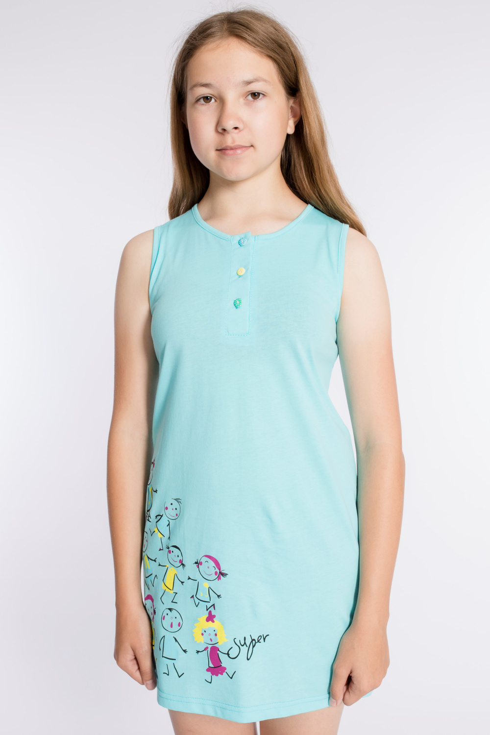 Сорочка для девочки выполнена из х/б полотна. Сверху застёжка на пуговицы. Спереди нанесён принт.