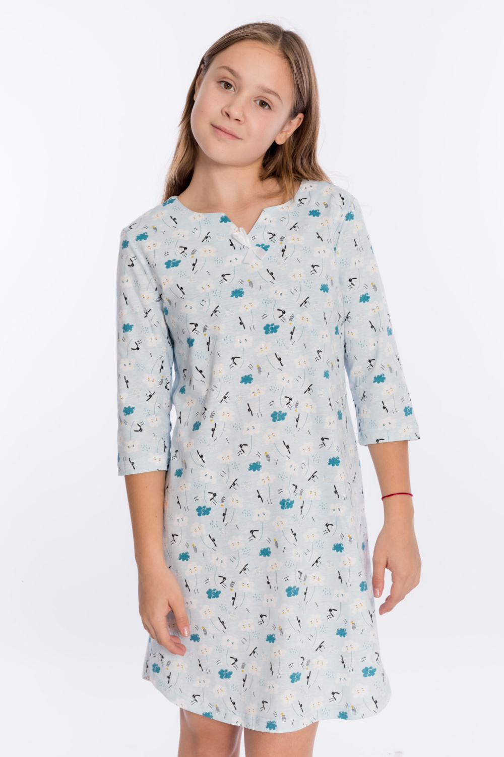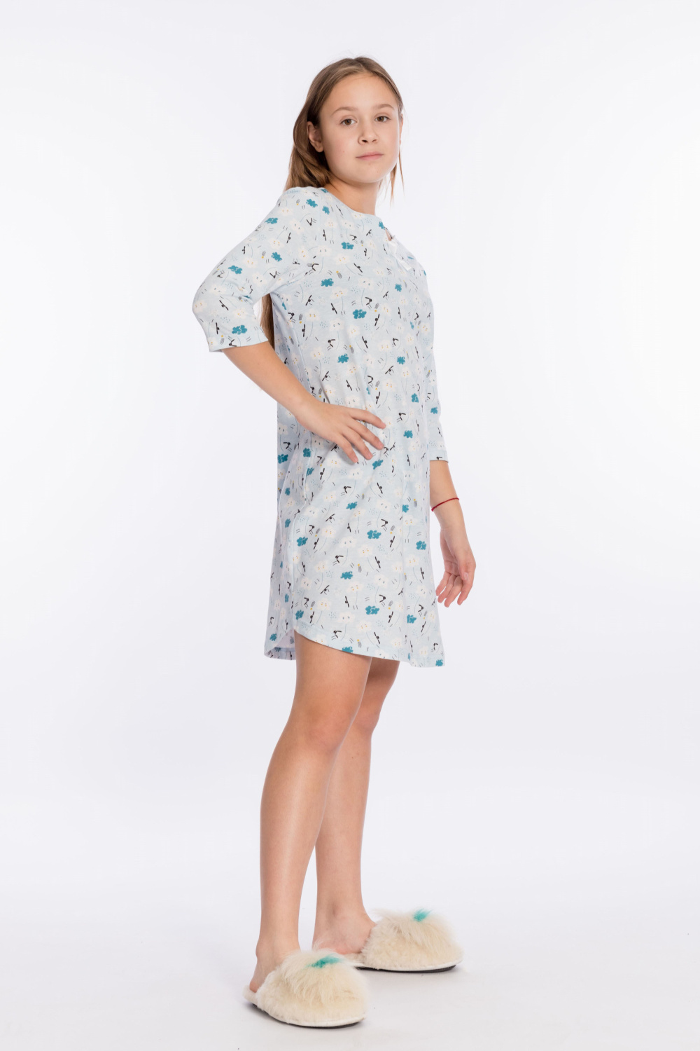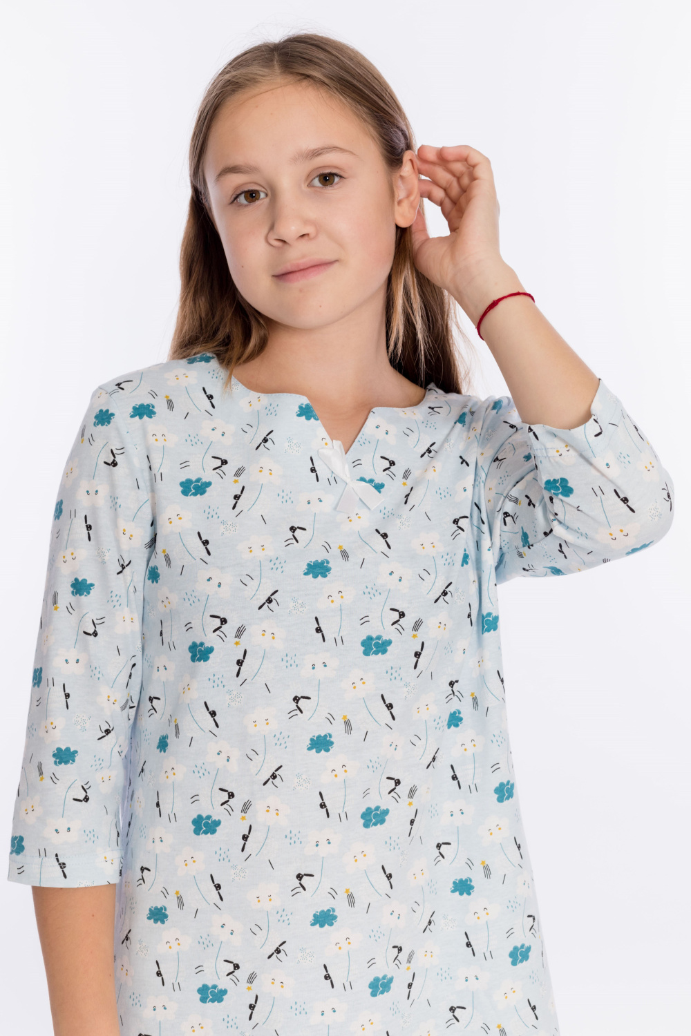 Сорочка из светлой кулирки с набивным рисунком, с втачным рукавом длиной 3/4. Спереди горловина оформлена декоративной "галочкой", ниже закреплен бантик. Низ сорочки со скруглением к боковому шву.