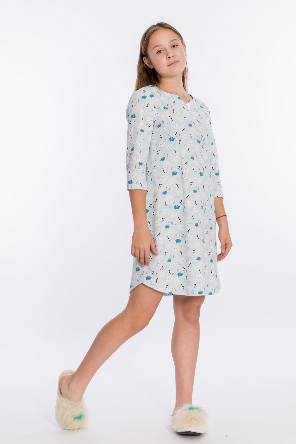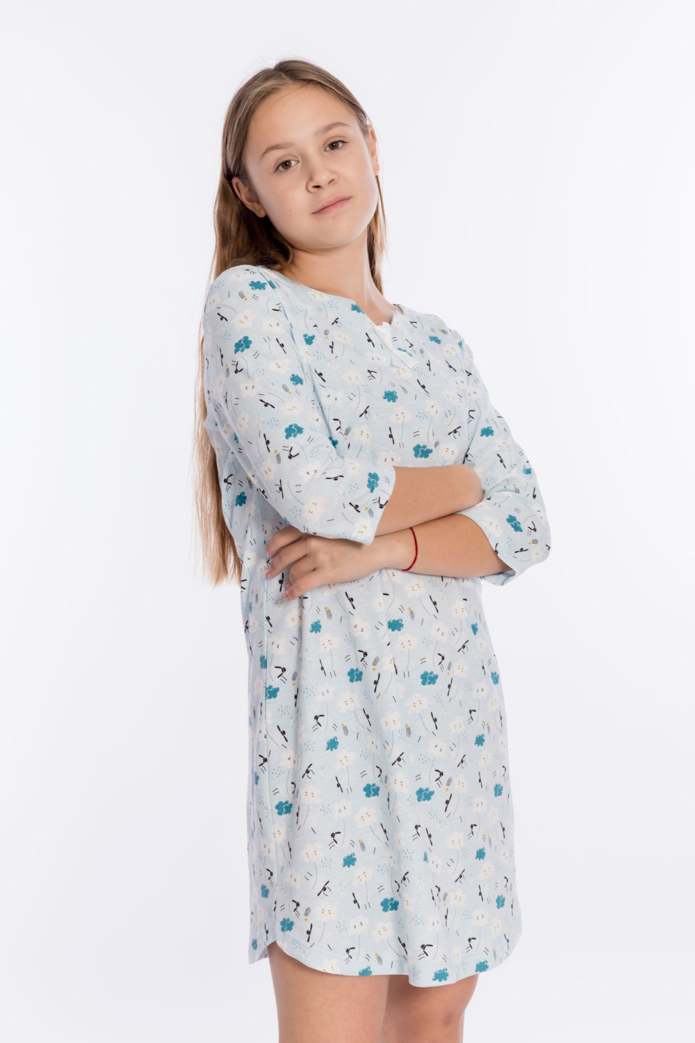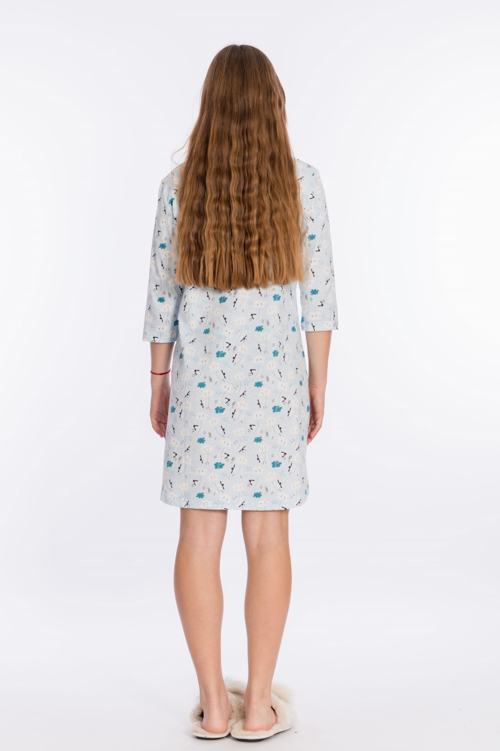 Сорочка из светлой кулирки с набивным рисунком, с втачным рукавом длиной 3/4. Спереди горловина оформлена декоративной "галочкой", ниже закреплен бантик. Низ сорочки со скруглением к боковому шву.