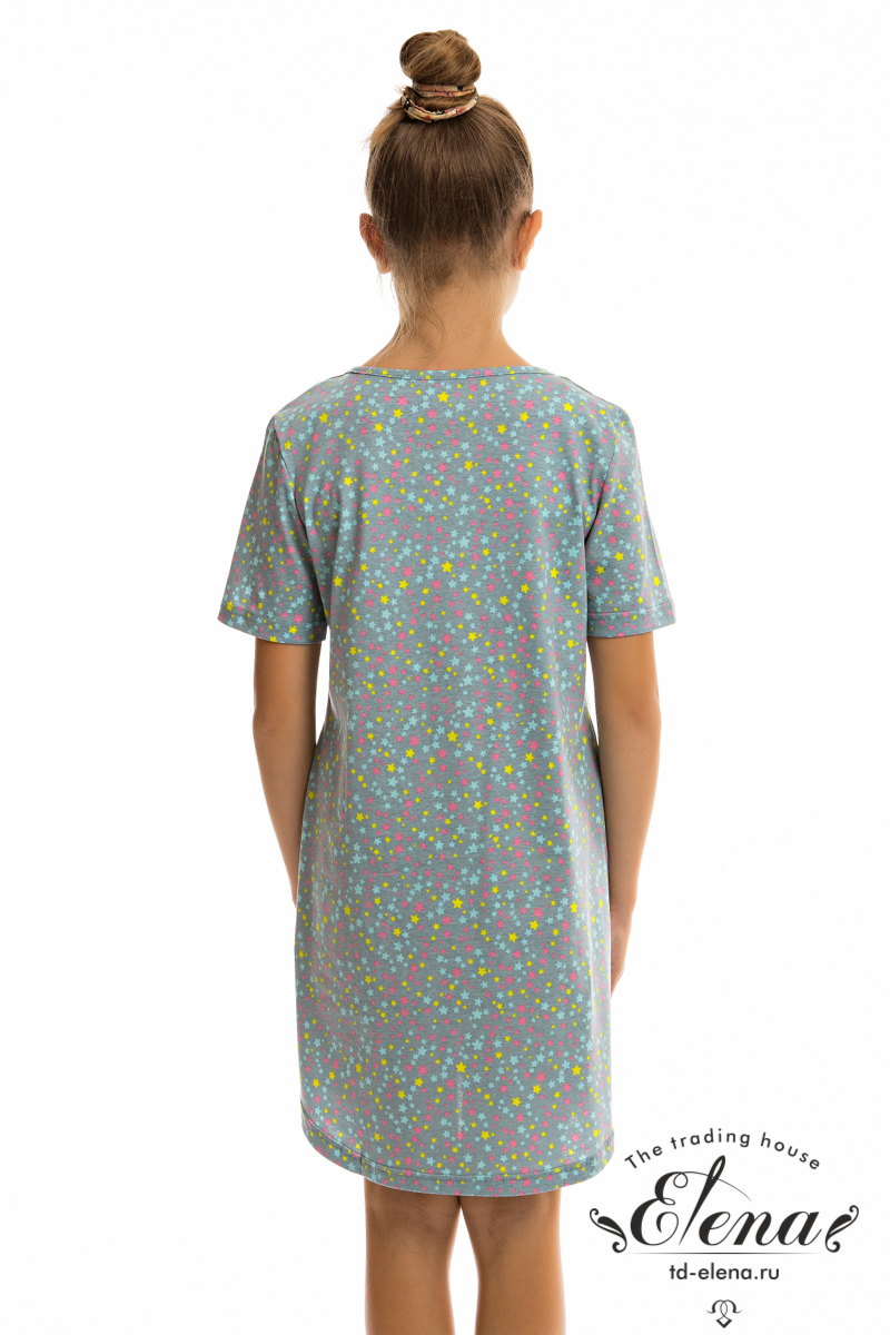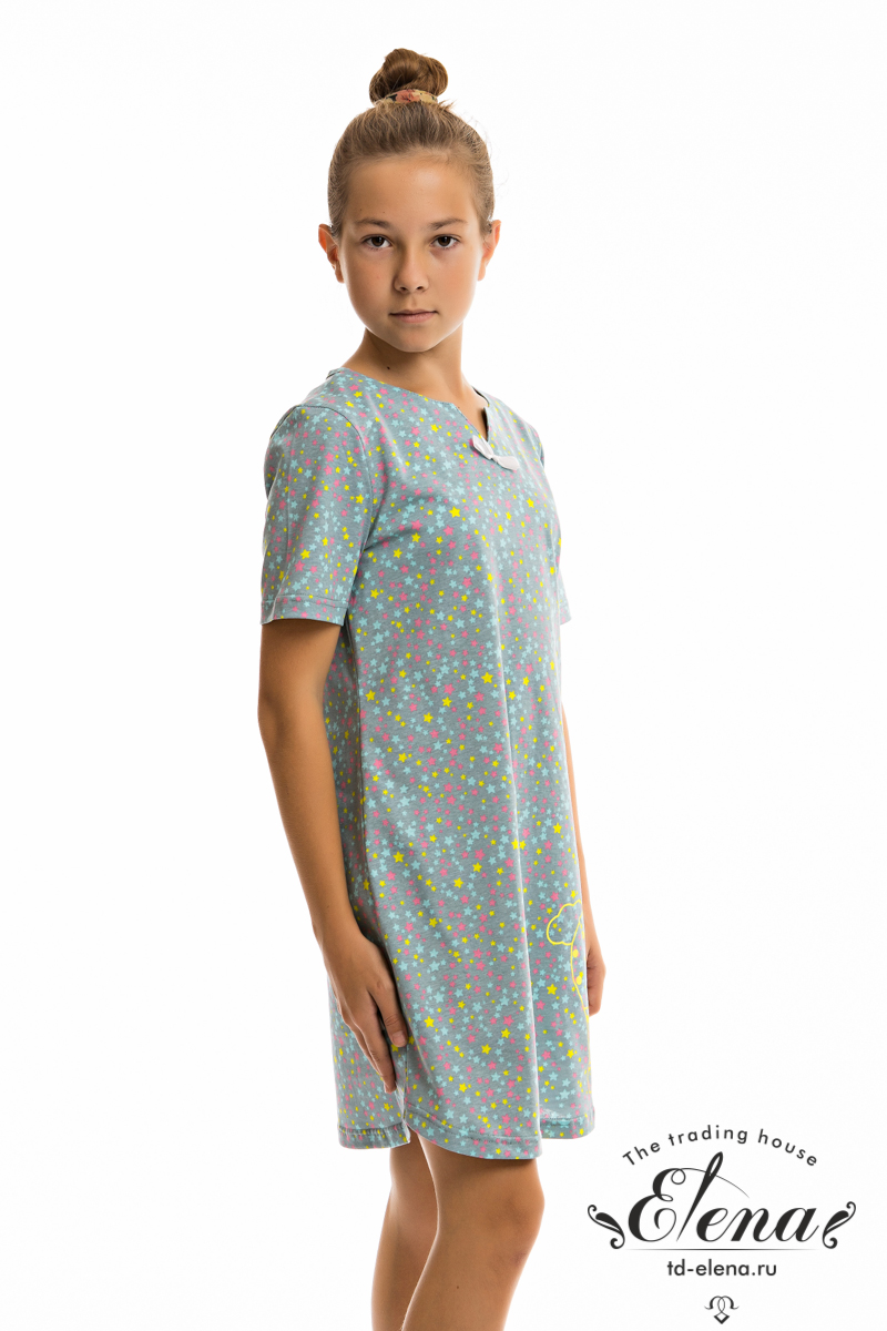 Сорочка выполнена из кулирки с набивным рисунком, с коротким втачным рукавом. Спереди горловина оформлена декоративной "галочкой", ниже закреплен бантик. Низ сорочки со скруглением к боковому шву. Спереди нанесён принт.