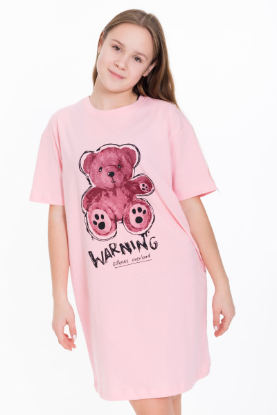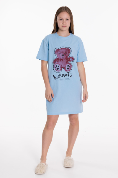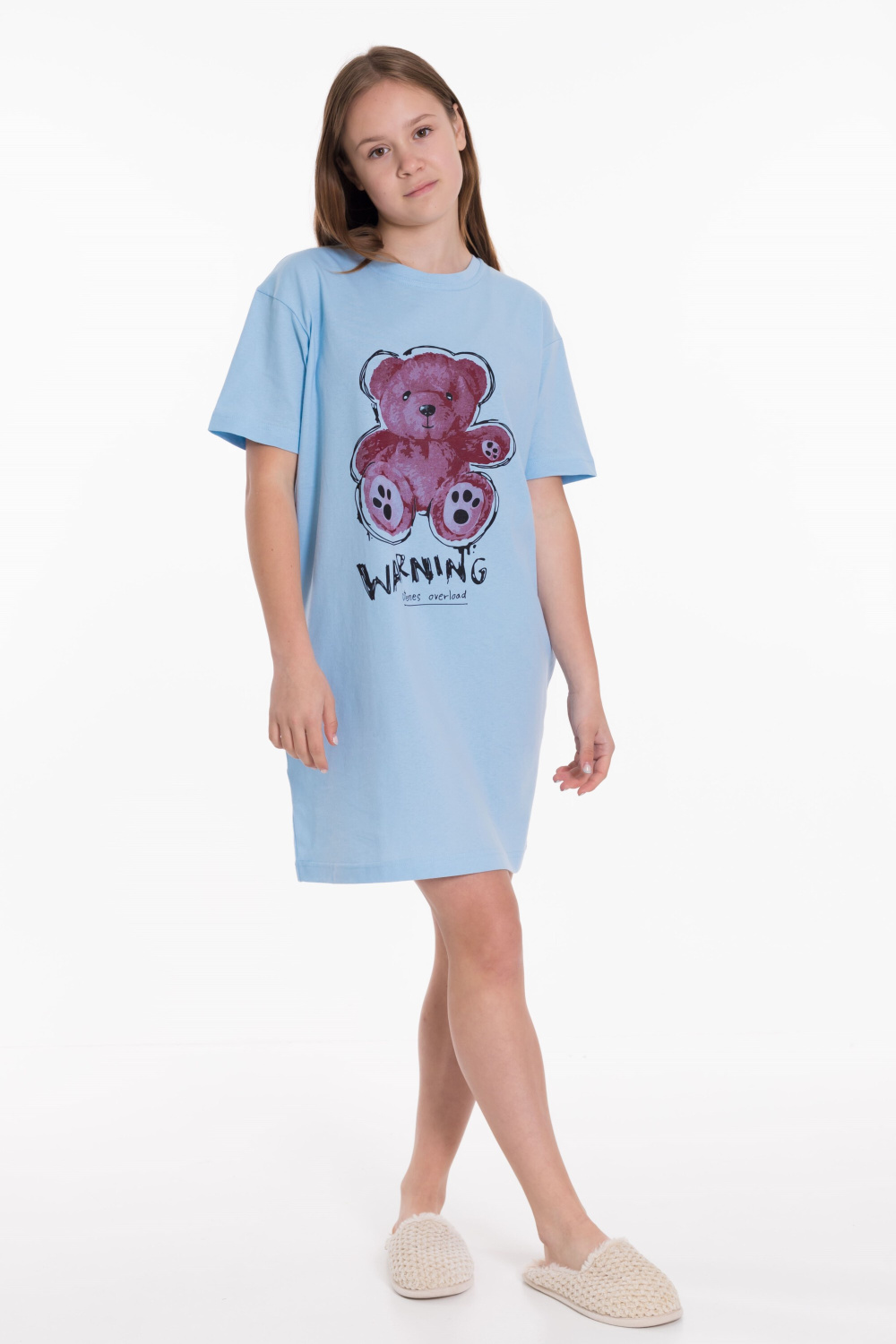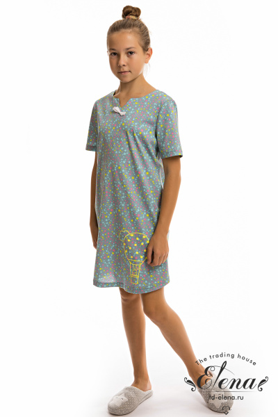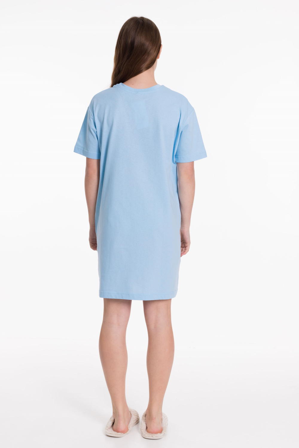Сорочка-футболка выполнена из однотонной кулирки. С коротким рукавом и принтом спереди. Круглый вырез горловины оформлен планкой.