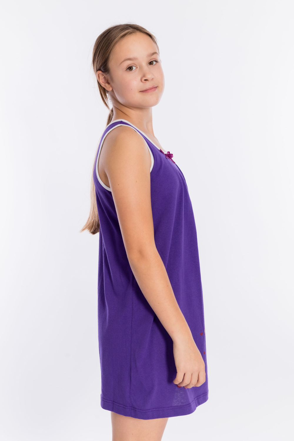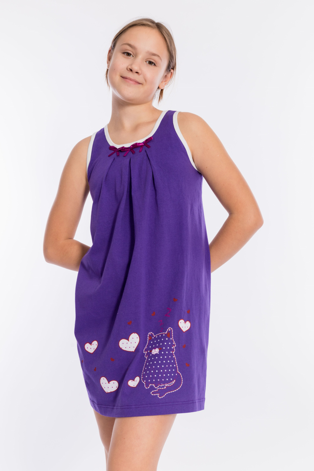 Сорочка из однотонной кулирки. Спереди расположен принт. В качестве отделки бантики и складки по горловине изделия, а также белая бейка в цвет принта.
