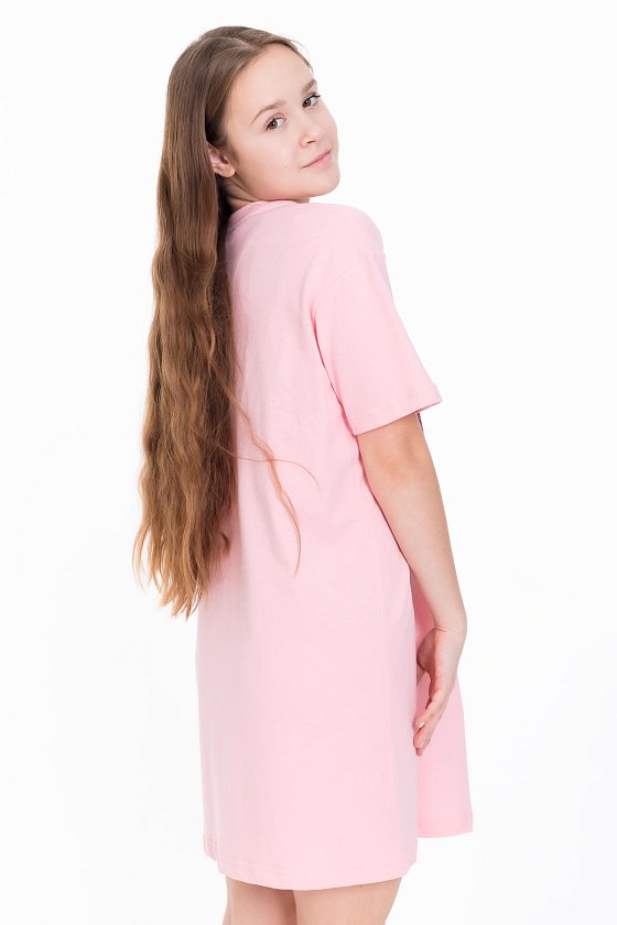 Сорочка-футболка для девочки из однотонной кулирки розового цвета очаровательна и уютна. Прямой крой с коротким рукавом и круглым вырезом горловины делают ее комфортной и практичной в использовании. Принт на передней части добавляет игривости и оригинальности к изделию, придавая индивидуальность.