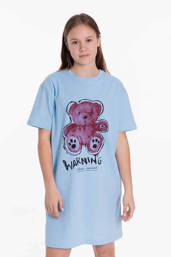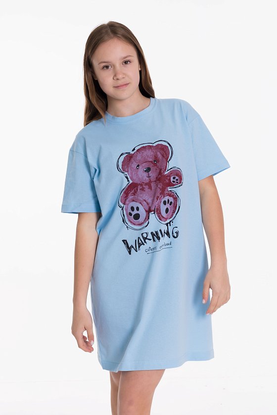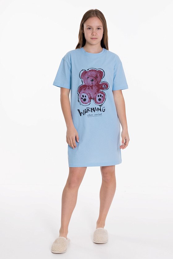 Сорочка-футболка выполнена из однотонной кулирки. С коротким рукавом и принтом спереди. Круглый вырез горловины оформлен планкой.