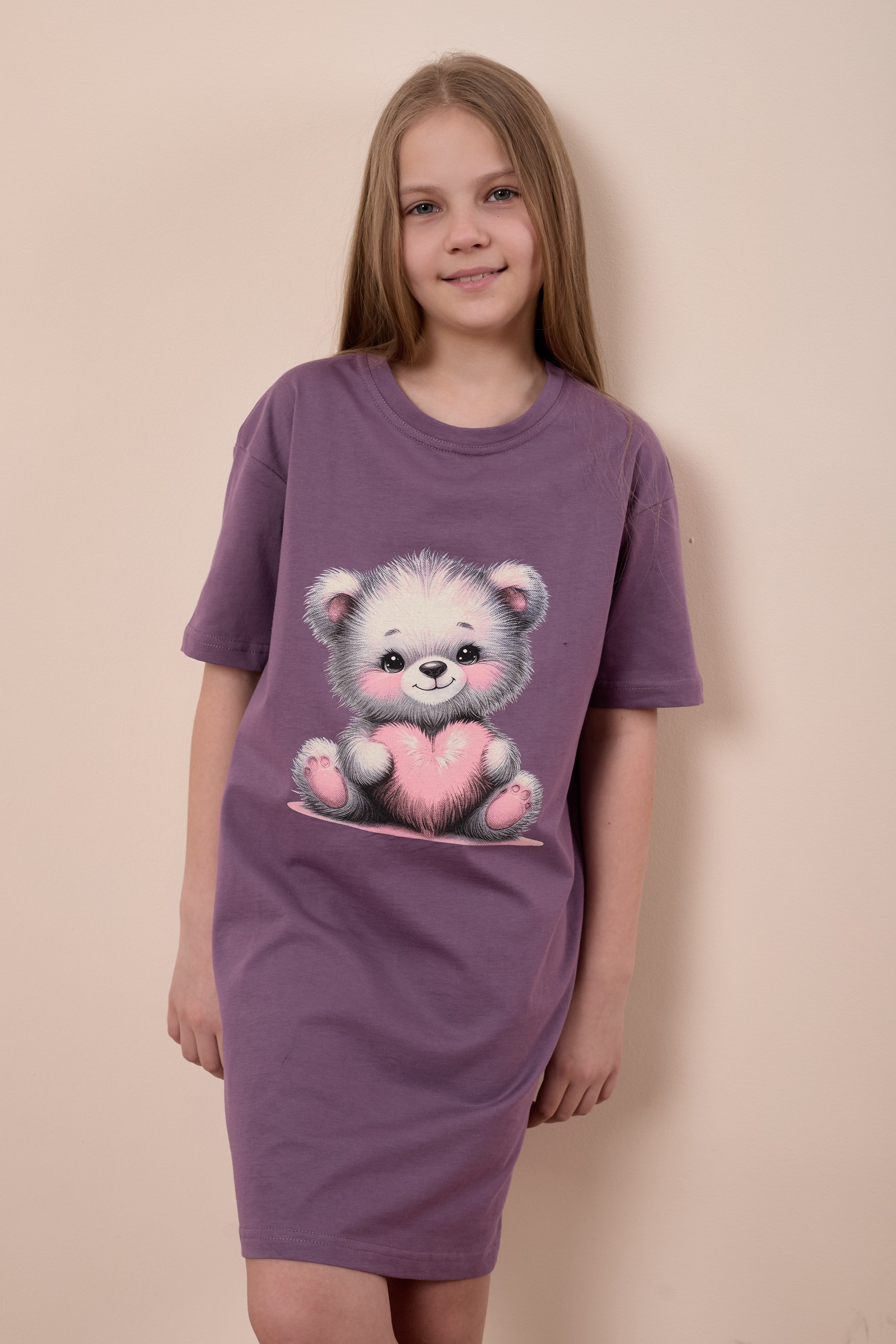 Сорочка-футболка для девочки из однотонной кулирки нежно-сиреневого цвета очаровательна и уютна. Прямой крой с коротким рукавом и круглым вырезом горловины делают ее комфортной и практичной в использовании. Принт на передней части добавляет игривости и оригинальности к изделию, придавая индивидуальность.