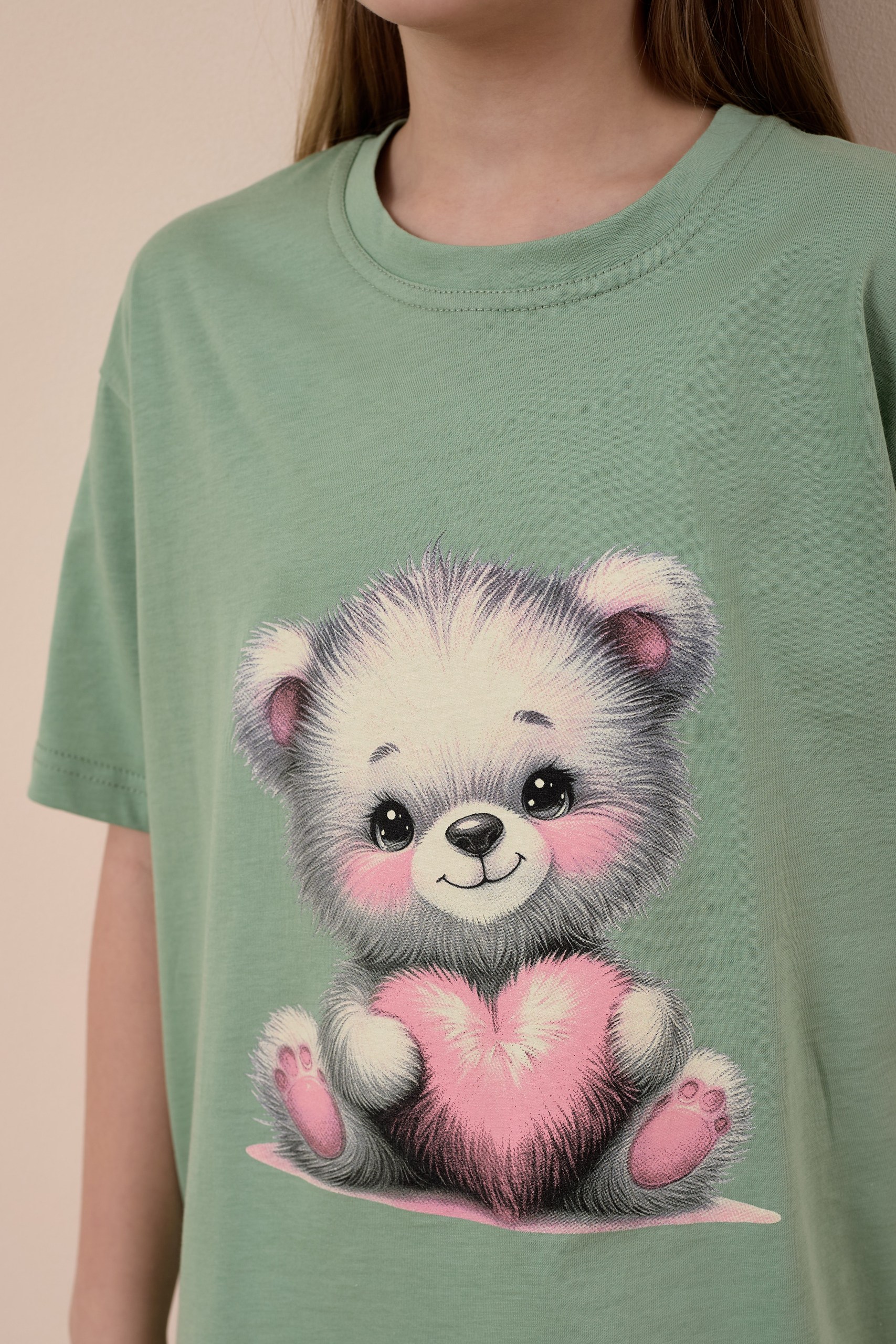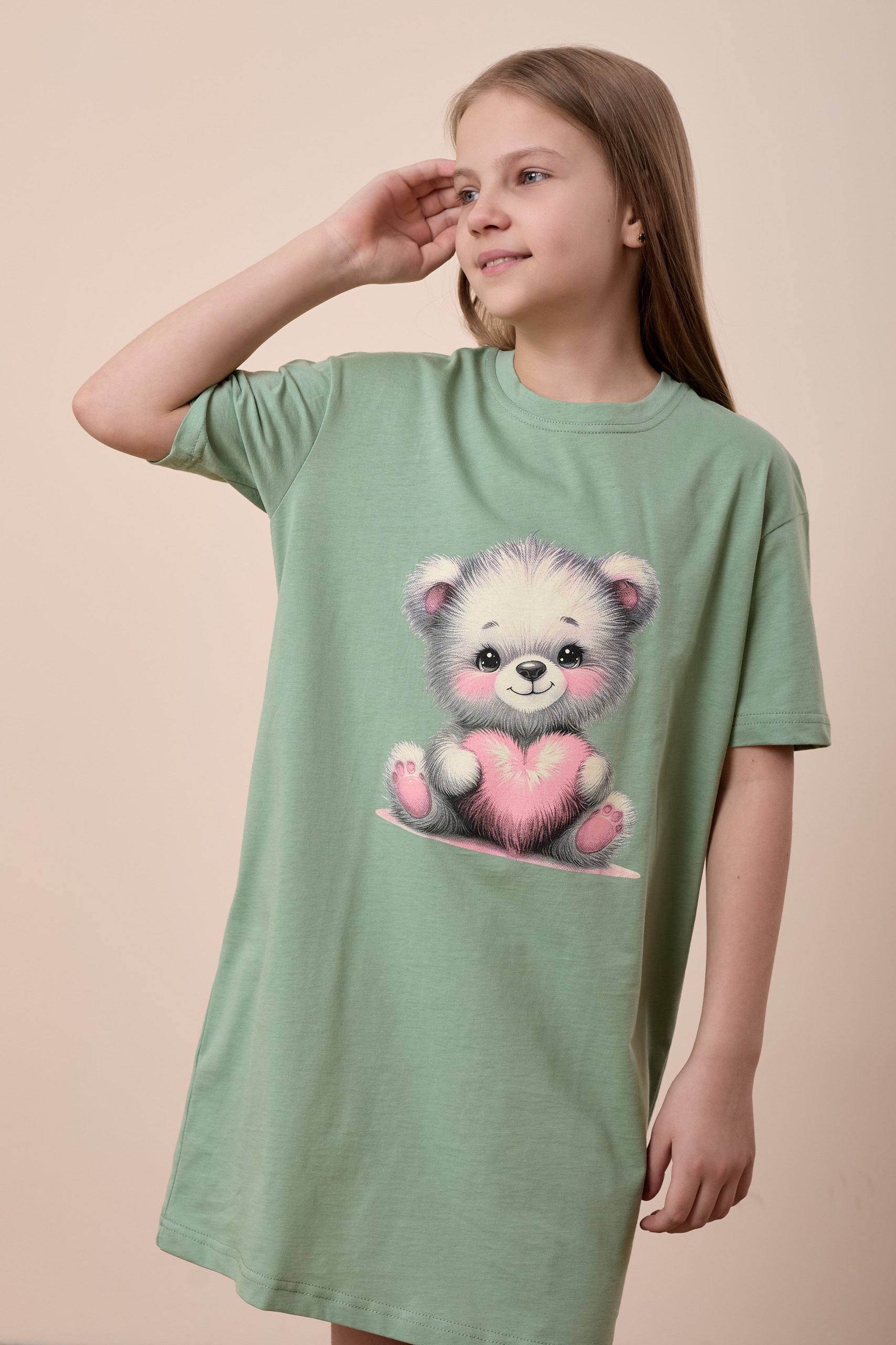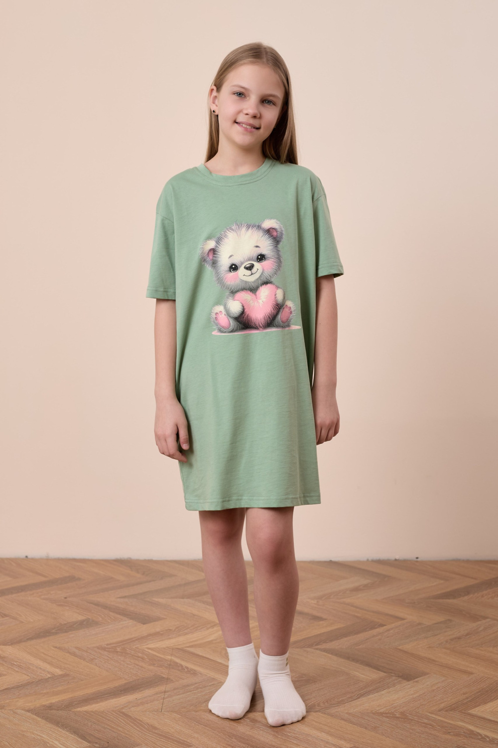 Сорочка-футболка для девочки из однотонной кулирки пастельно-зеленого цвета очаровательна и уютна. Прямой крой с коротким рукавом и круглым вырезом горловины делают ее комфортной и практичной в использовании. Принт на передней части добавляет игривости и оригинальности к изделию, придавая индивидуальность.