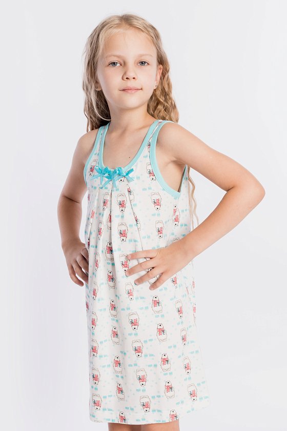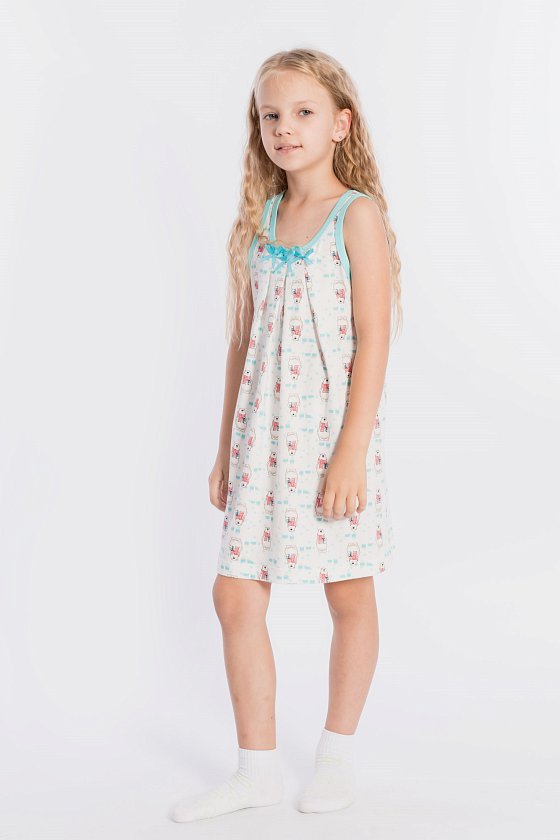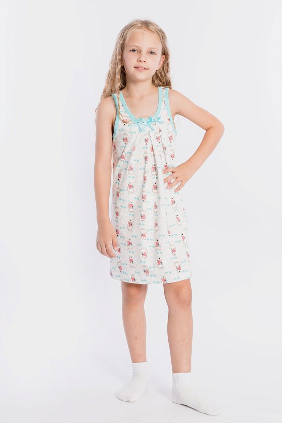 Сорочка детская выполнена из хлопкового полотна, со складками и бантами спереди, горловина и проймы обработаны бейкой.