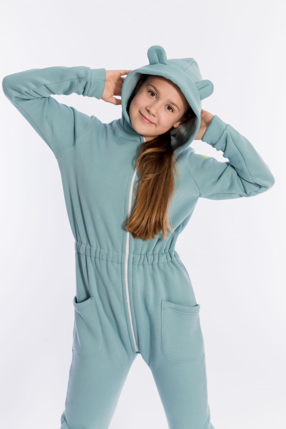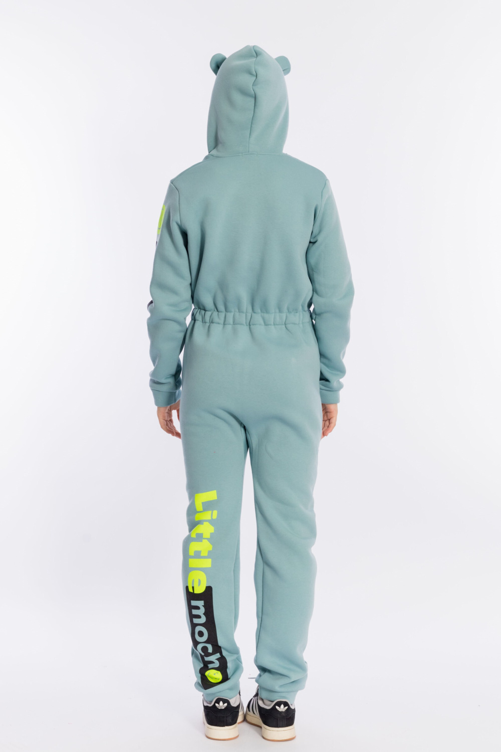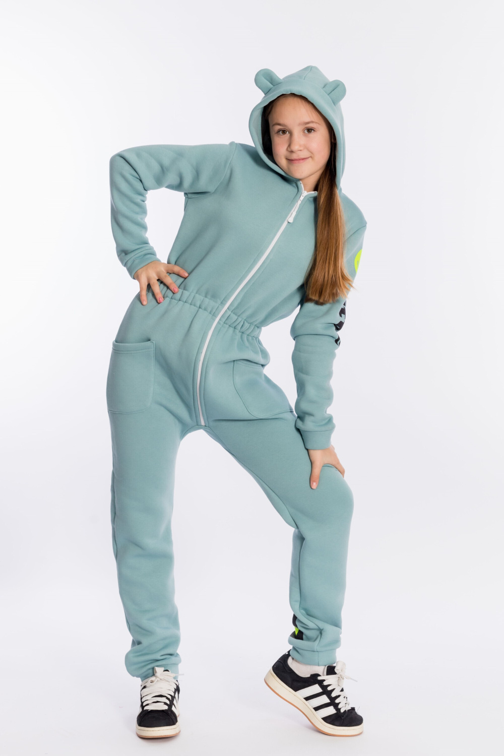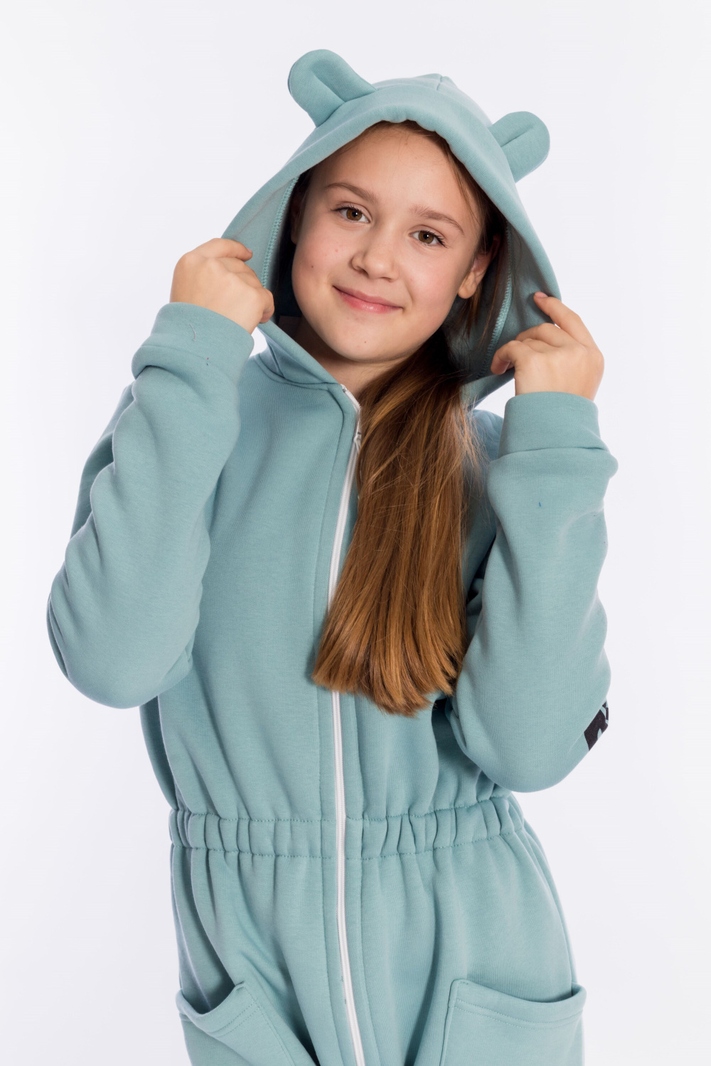Комбинезон из однотонного футера с начёсом. С капюшоном с "ушками", застёжкой на молнию и накладными карманами спереди. По талии кулиска с резинкой. Рукава и низ брюк с притачными манжетами. Сбоку на рукаве и сзади костюм украшен принтом.