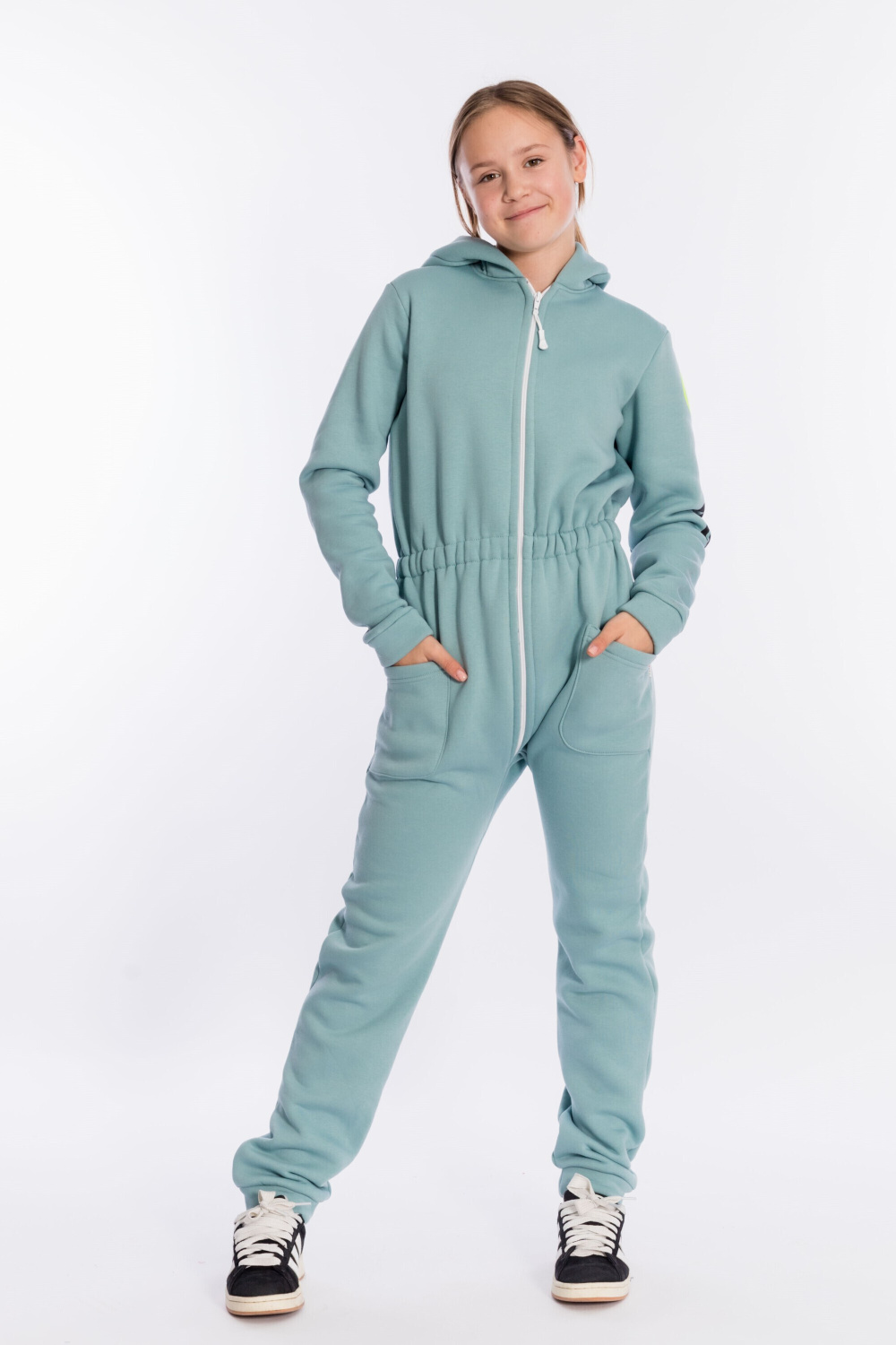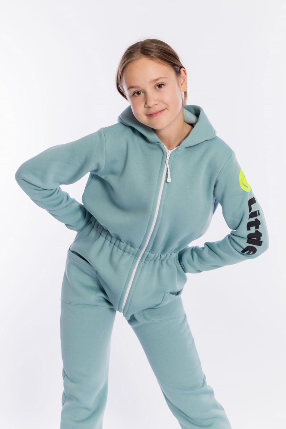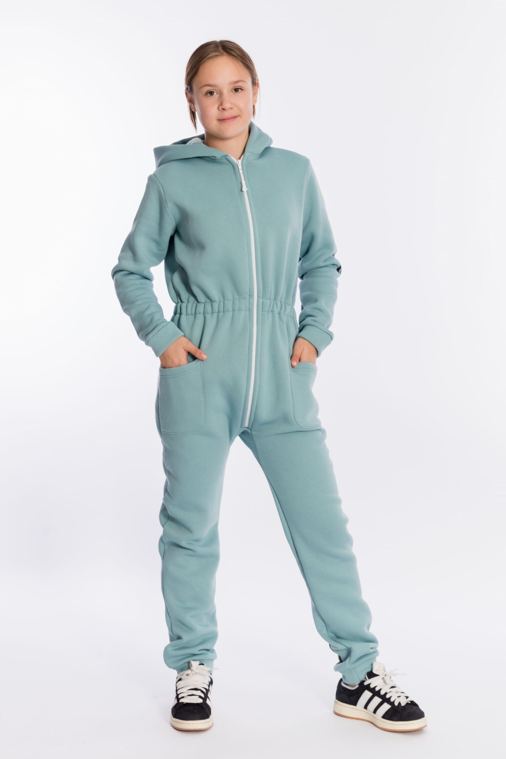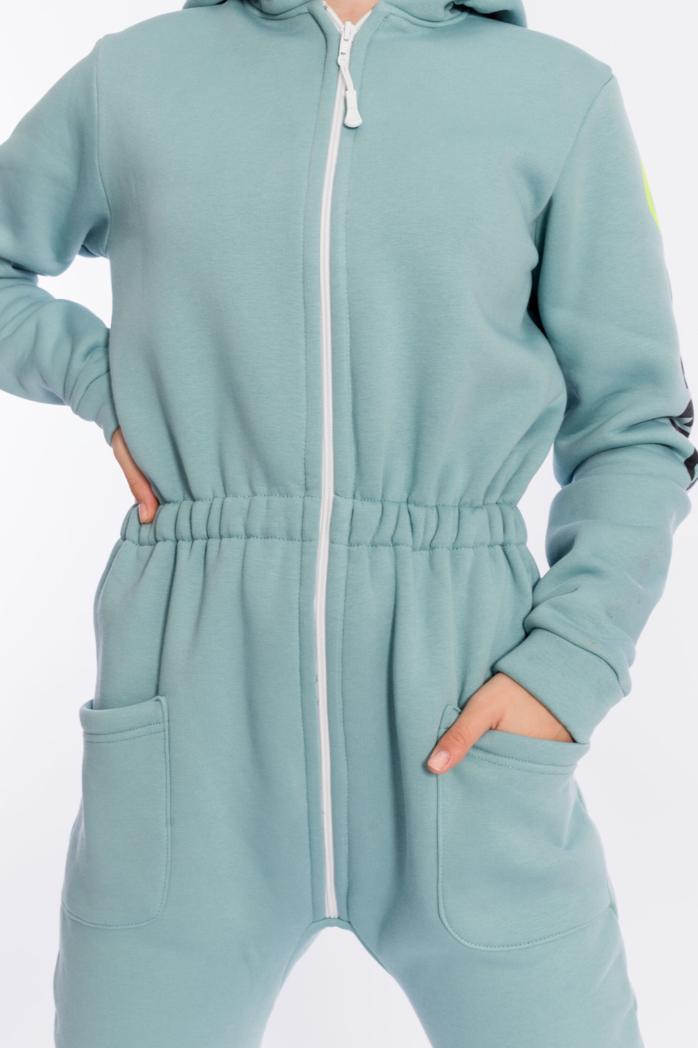 Комбинезон из однотонного футера с начёсом. С капюшоном с "ушками", застёжкой на молнию и накладными карманами спереди. По талии кулиска с резинкой. Рукава и низ брюк с притачными манжетами. Сбоку на рукаве и сзади костюм украшен принтом.