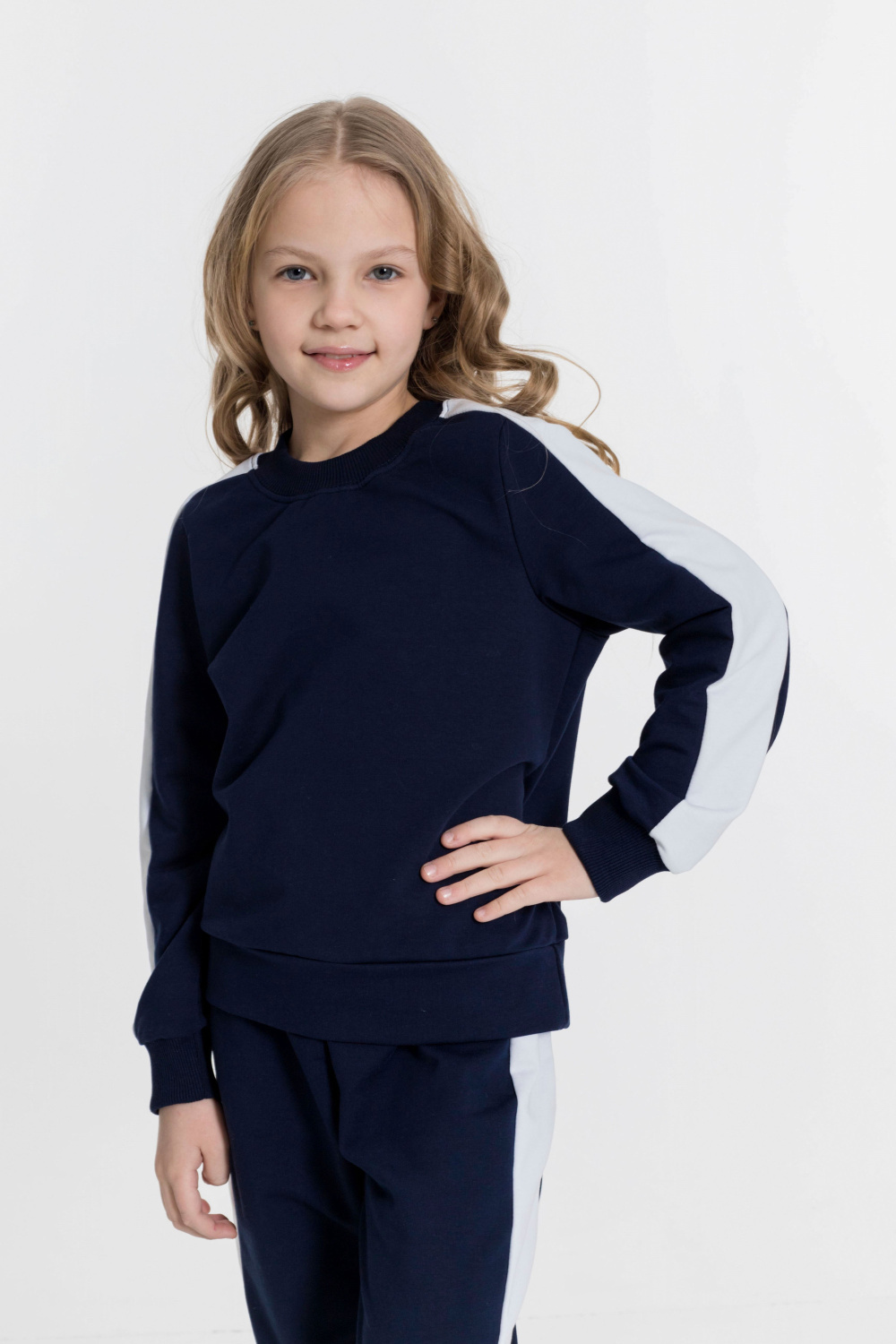 Толстовка  - круглый вырез на манжете, рукав на манжете,вставка по плечу и середине рукава контрастного цвета.