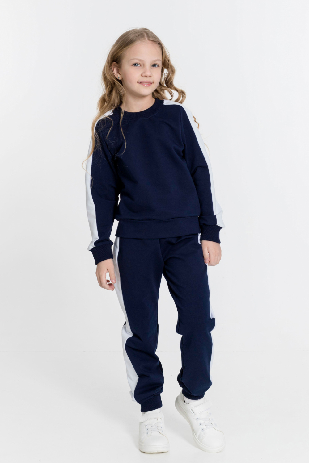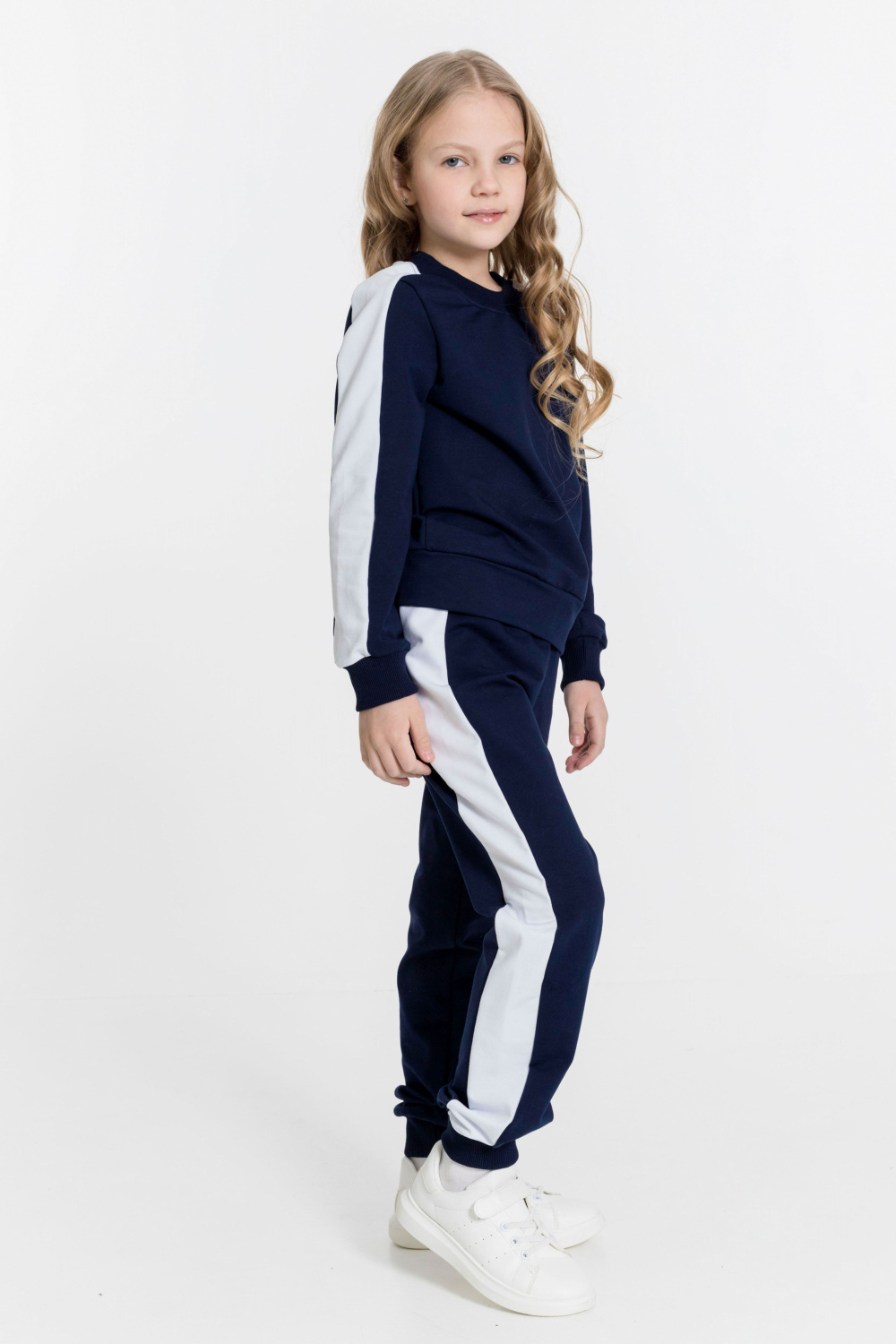Брюки - пояс на резинке, внизу на манжетах, по бокам вставка контрастного цвета.