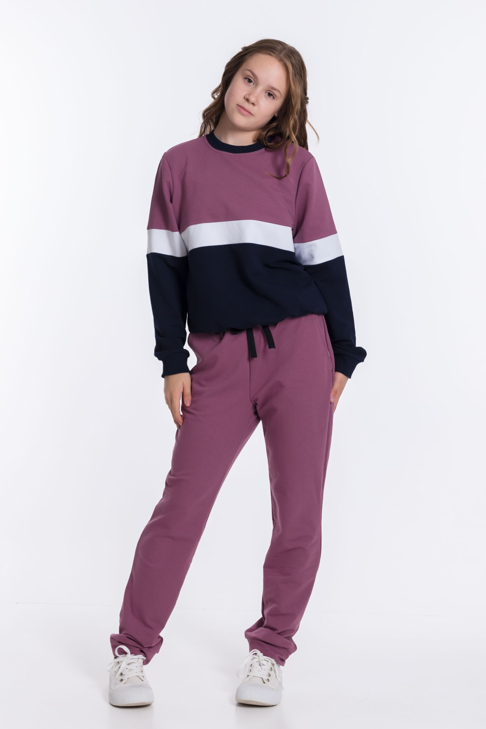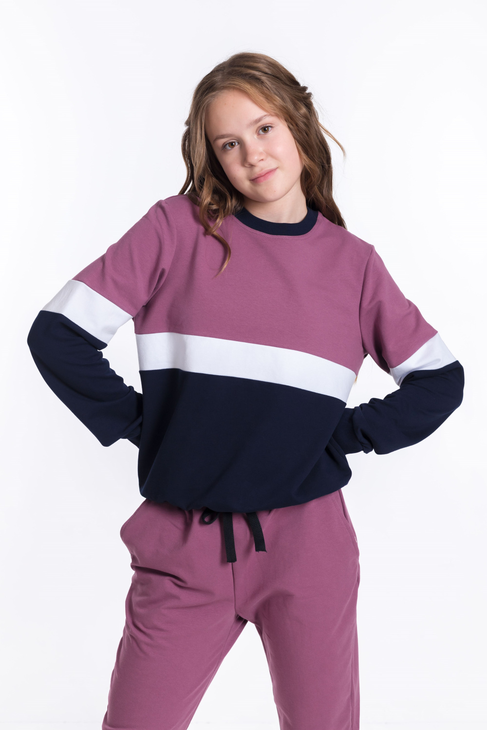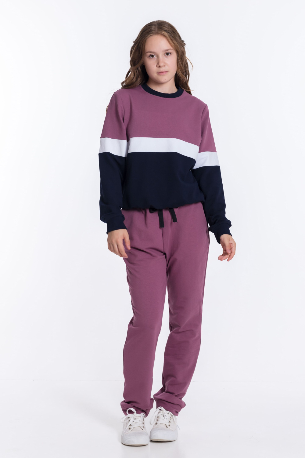 Костюм для девочки выполнен из мягкого и приятного к телу футера с добавлением лайкры. Толстовка имеет оригинальный дизайн: она комбинирована из трёх цветов полосами. Пояс, манжеты рукавов и планка горловины выполнены из эластичного материала кашкорсе, что обеспечивает комфортную посадку.