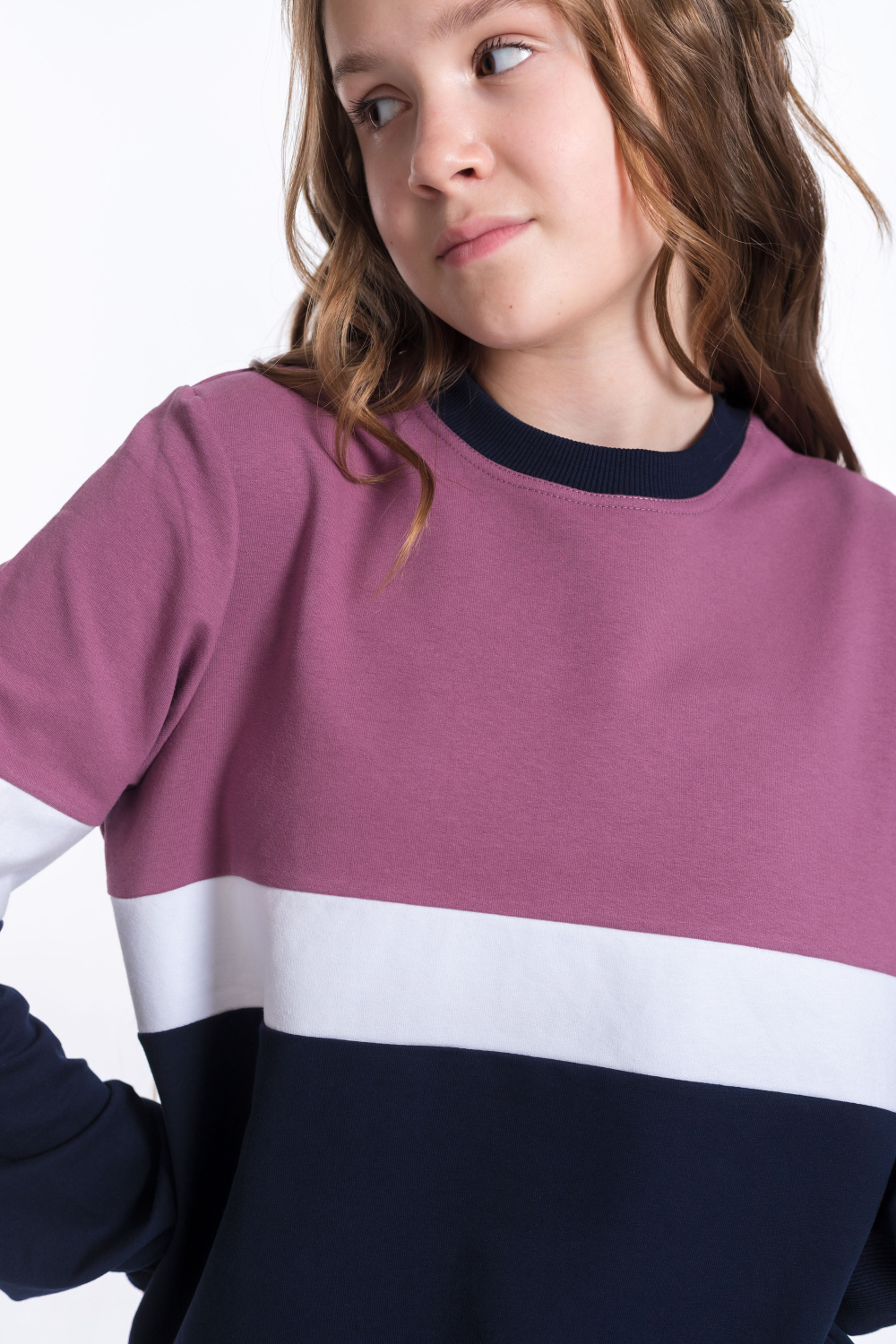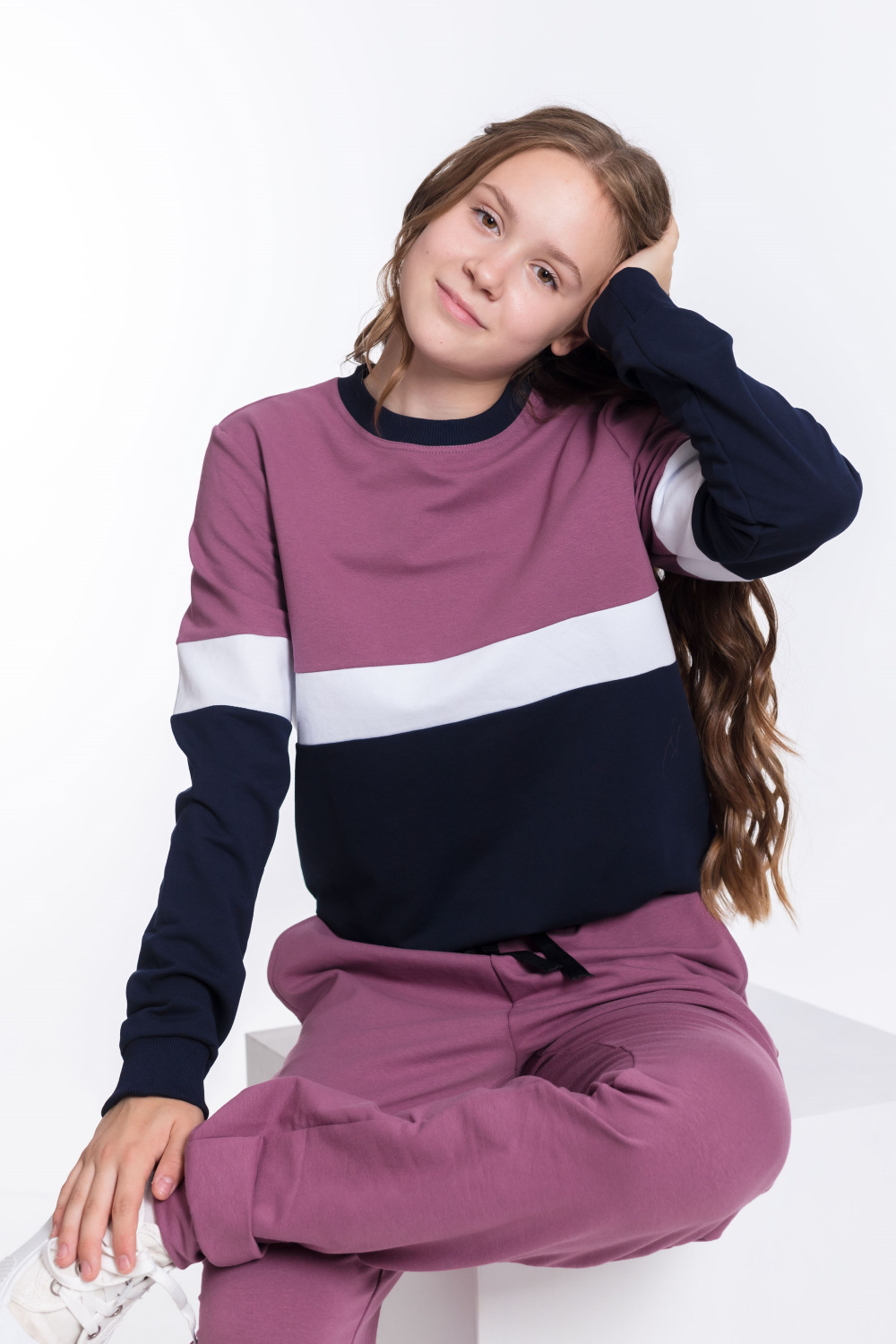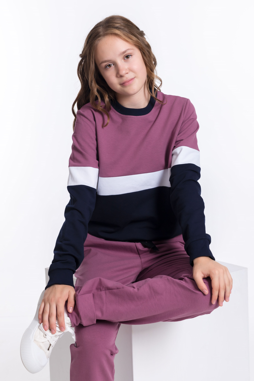 Костюм для девочки выполнен из мягкого и приятного к телу футера с добавлением лайкры. Толстовка имеет оригинальный дизайн: она комбинирована из трёх цветов полосами. Пояс, манжеты рукавов и планка горловины выполнены из эластичного материала кашкорсе, что обеспечивает комфортную посадку.