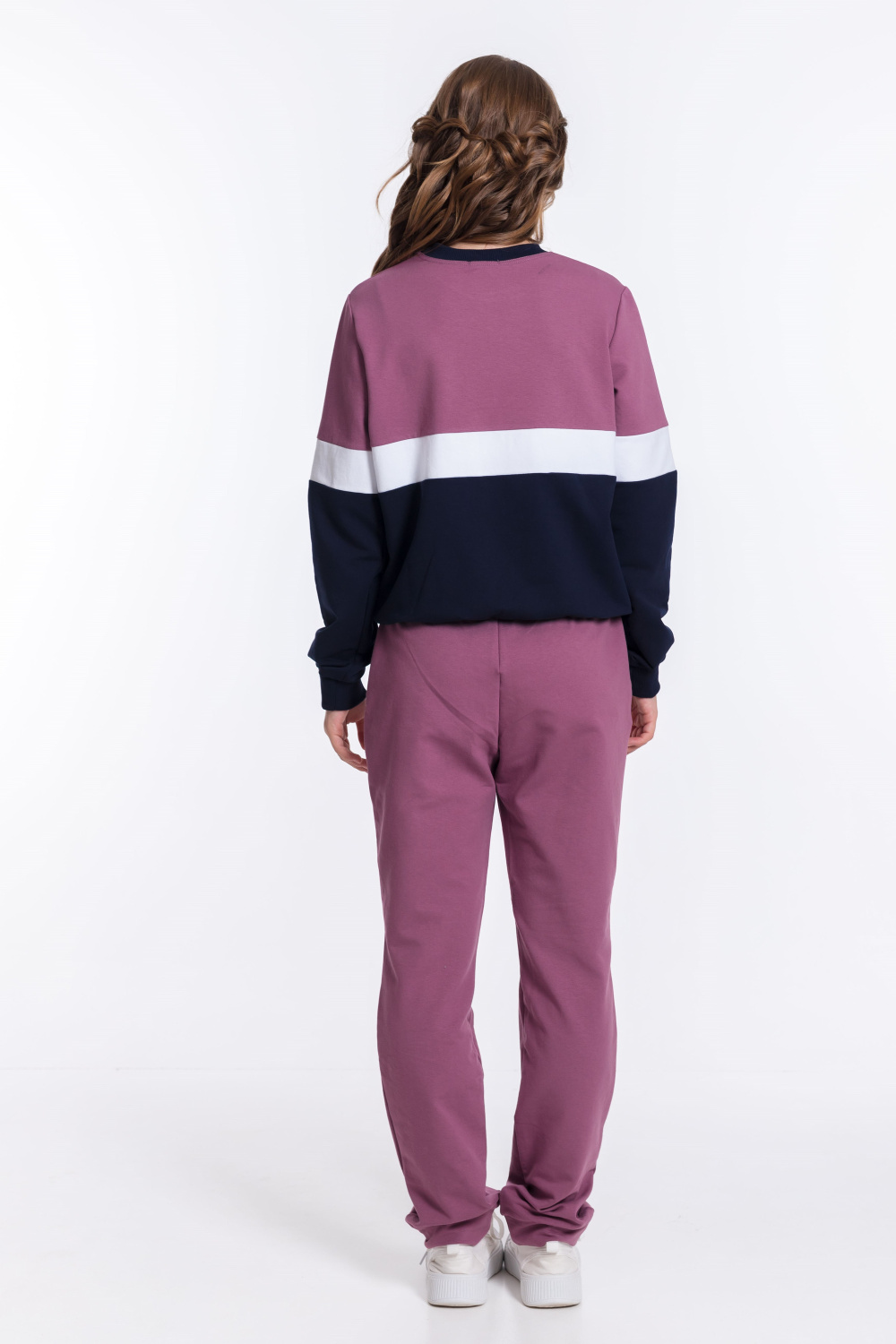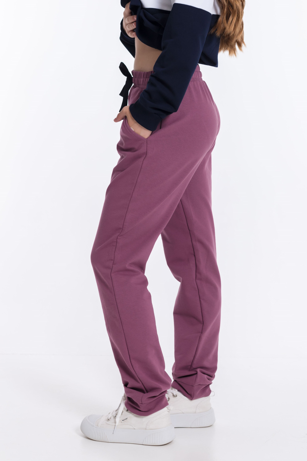 Брюки костюма имеют боковые карманы, притачной пояс и манжеты, которые обеспечивают свободу движений и комфорт при носке. Однотонный дизайн брюк позволяет сочетать их с различными элементами гардероба. Костюм подойдёт для повседневной носки, прогулок или занятий спортом.