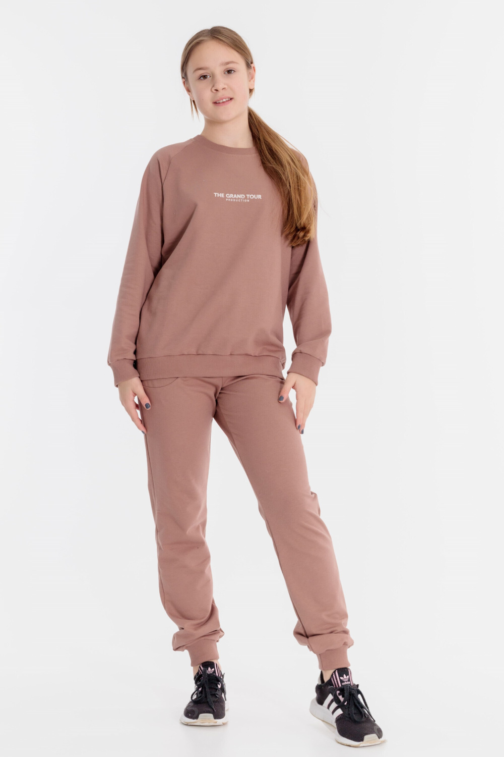 Костюм выполнен из однотонной футер петли c лайкрой, состоит из брюк и толстовки. Толстовка с рукавом покроя реглан с принтом спереди. Брюки с боковыми карманами и поясом на шнуре и резине.