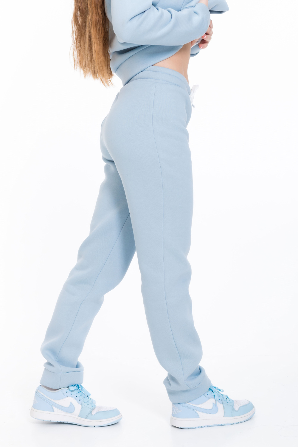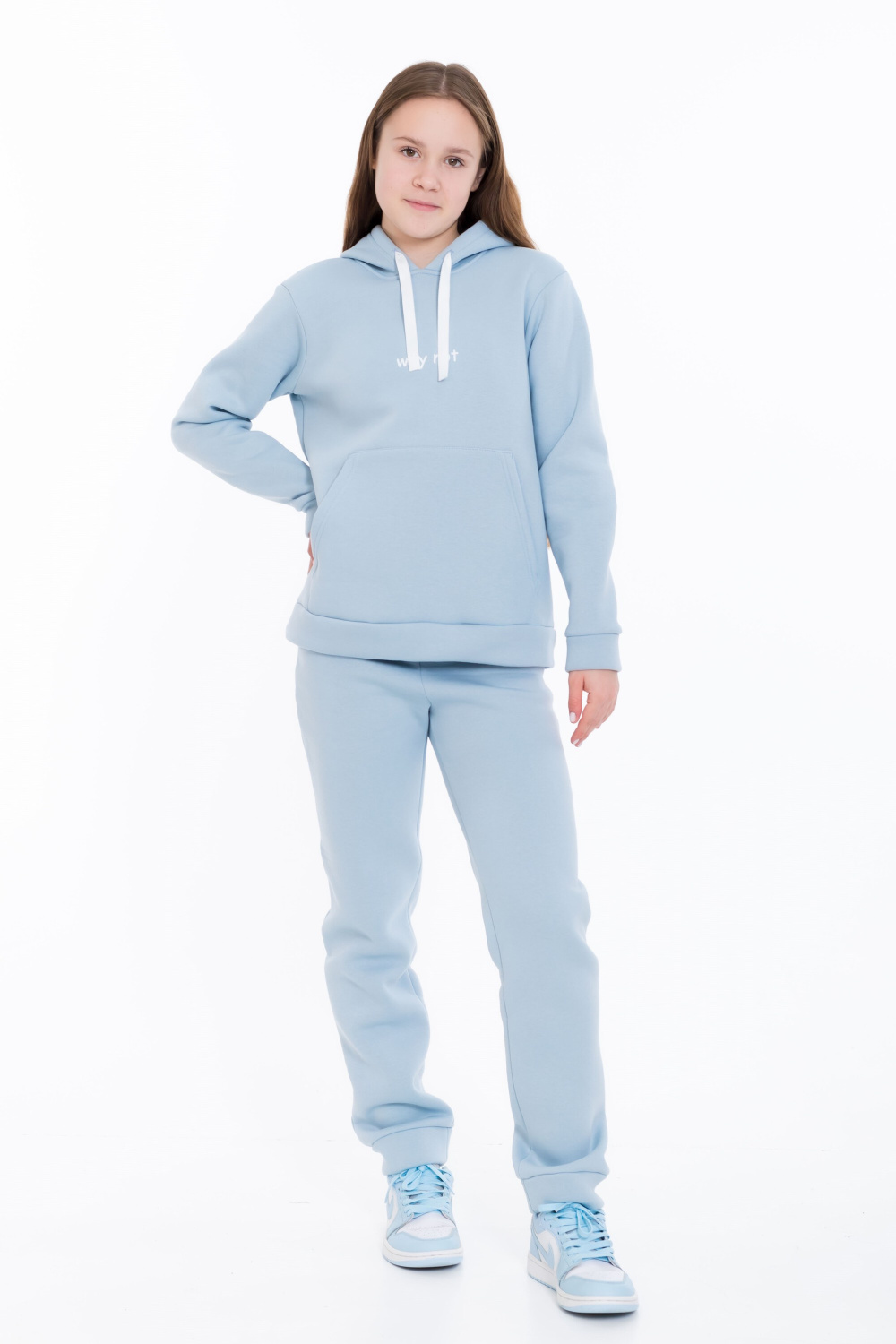 Пояс брюк на широкой резинке со шнуром, что обеспечивает удобную фиксацию и позволяет регулировать посадку. Такой костюм идеально подойдёт для повседневной носки, отдыха или активного отдыха.