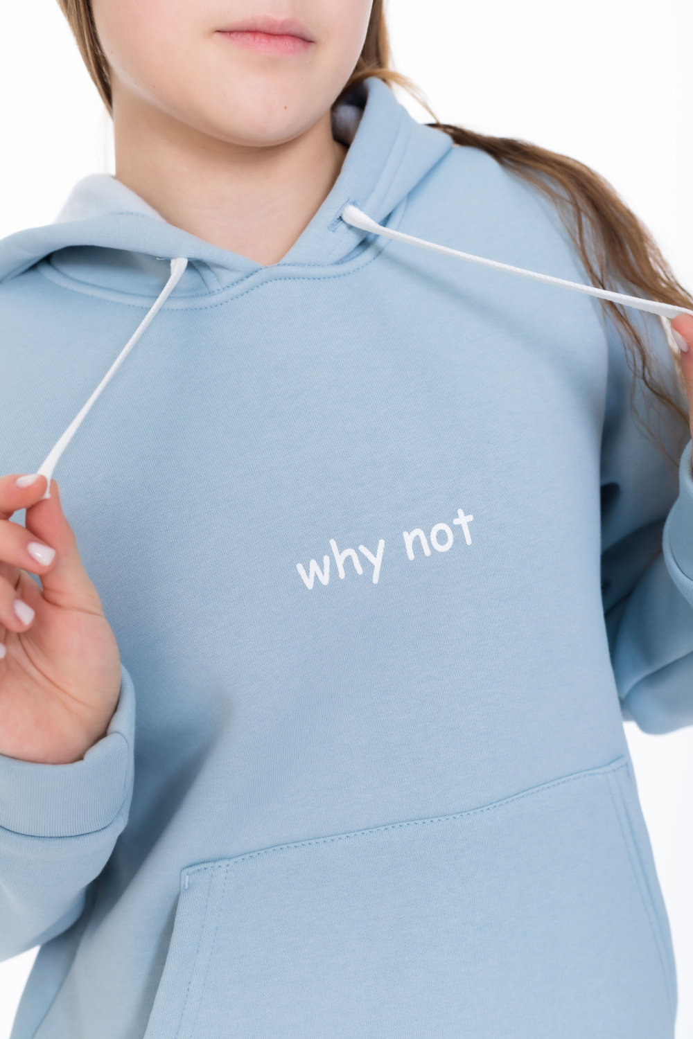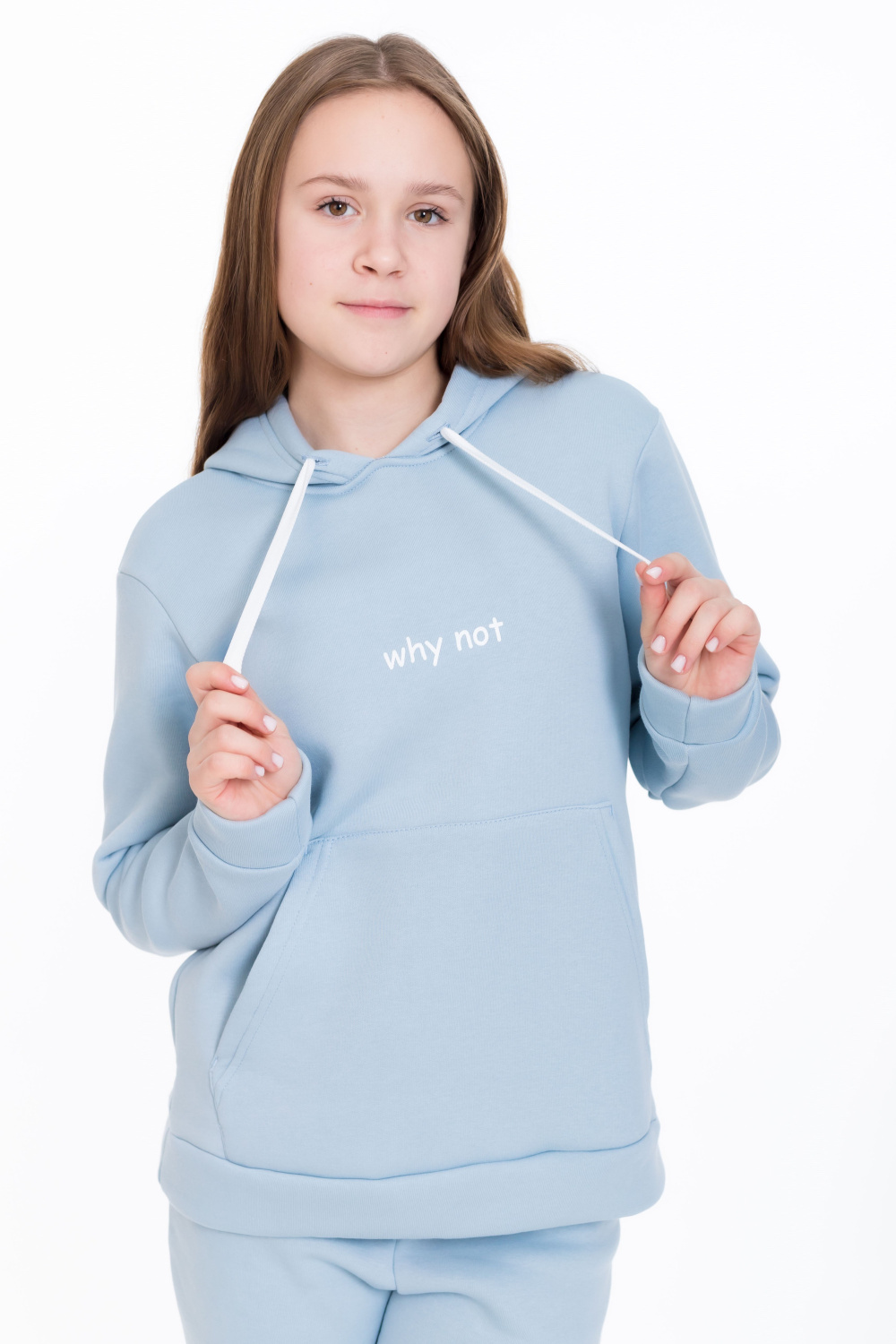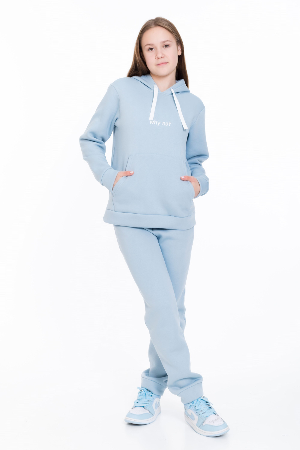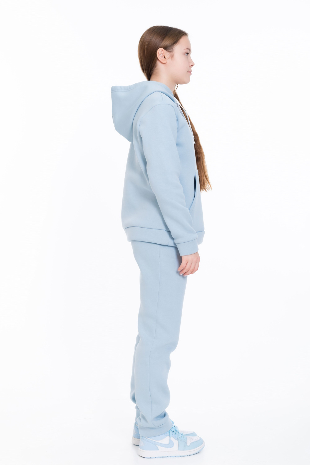 Костюм из футера с начёсом (трёхнитка) серо-голубого цвета  — отличный выбор для комфортного повседневного образа. Он состоит из толстовки с капюшоном и брюк.