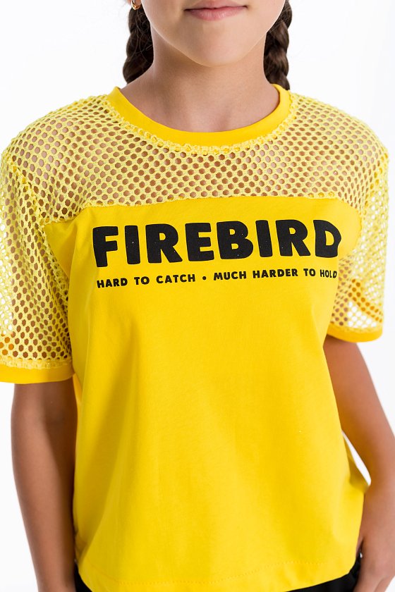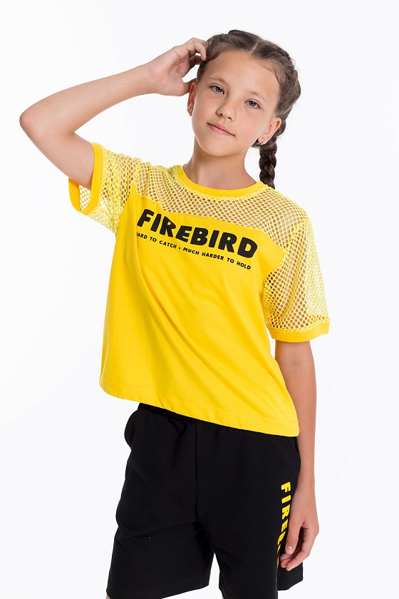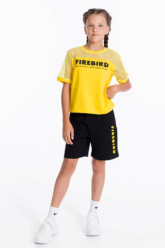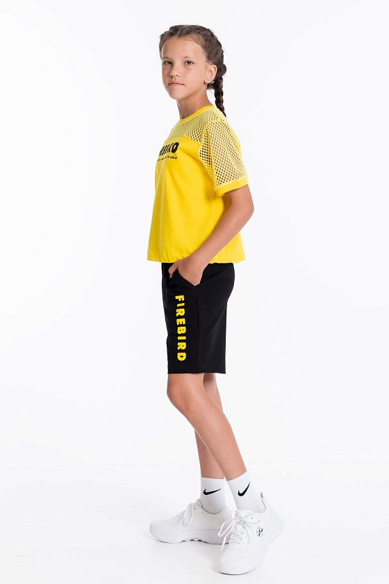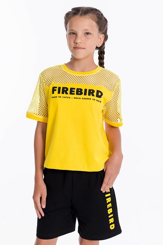 Футболка с кокеткой из сетки спереди и сзади, коротким втачным рукавом. Горловина и низ рукава обработаны планкой. Принт на полочке и левой половинке шорт.