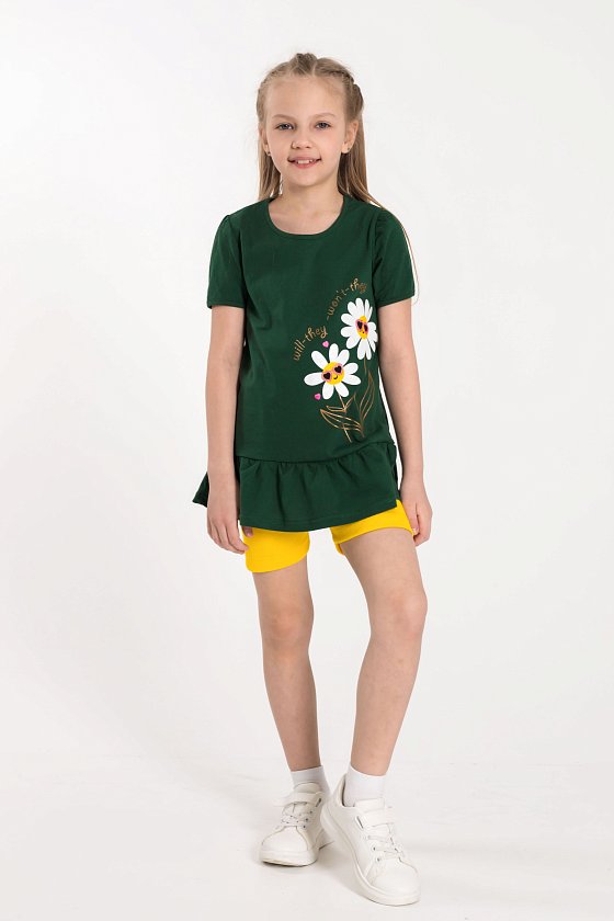 Костюм состоит из однотонных велосипедок из кашкорсе и однотонной футболки из кулирки.