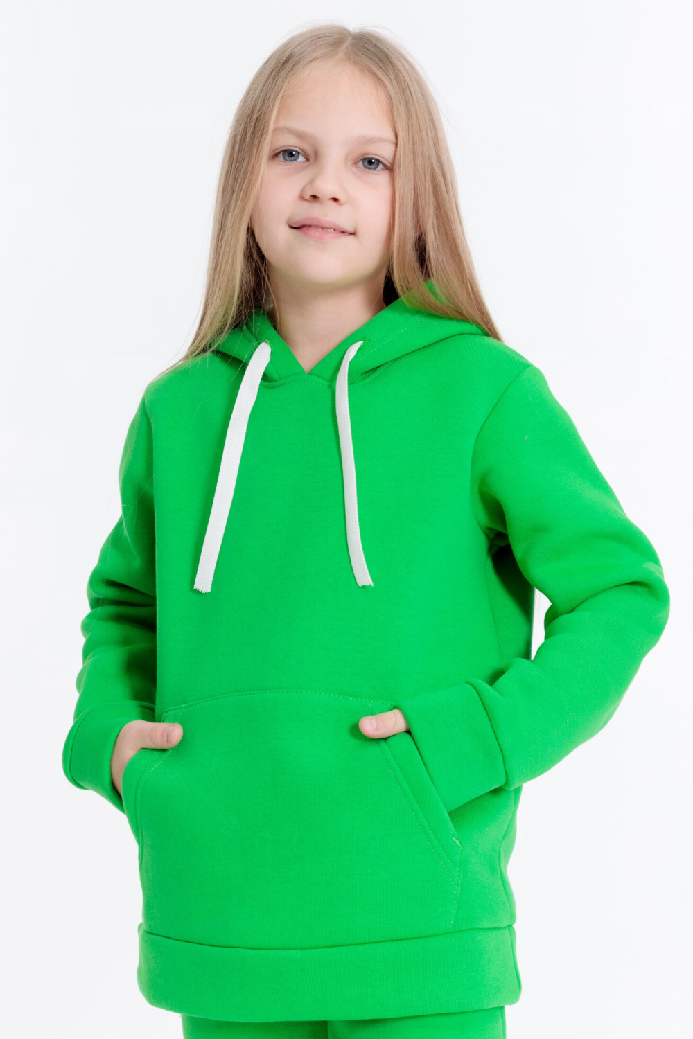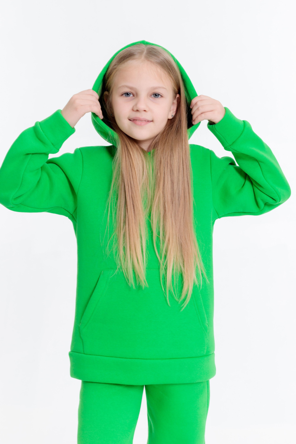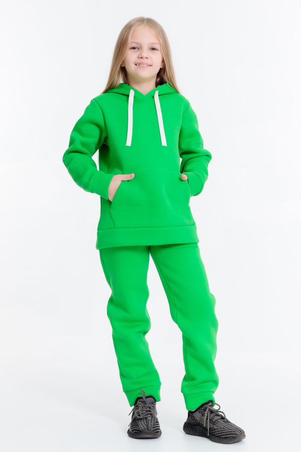 Костюм выполнен из однотонного полотна с начёсом, состоит из брюк и толстовки. Толстовка с карманом-кенгуру, ширина капюшона регулируется при помощи шнура, длинные рукава заканчиваются манжетами. Брюки с поясом на резине, низ на манжетах.
