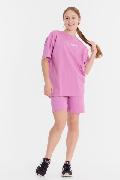 Модный костюм свободного силуэта выполнен из однотонной кулирки, 100% хлопок, состоит из шорт и футболки. Футболка с коротким втачным рукавом и принтом спереди. Шорты слегка расширены, с боковыми карманами и притачным поясом на резине.