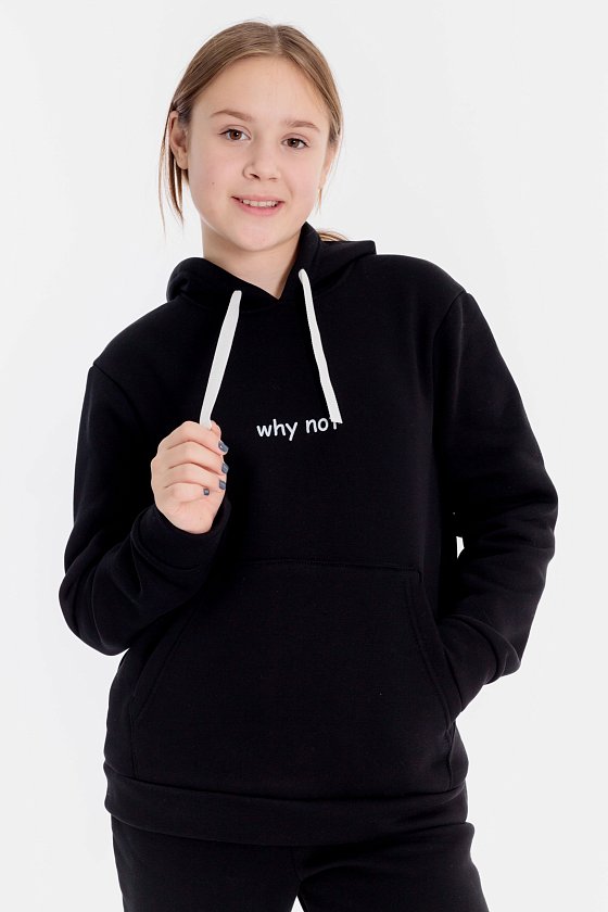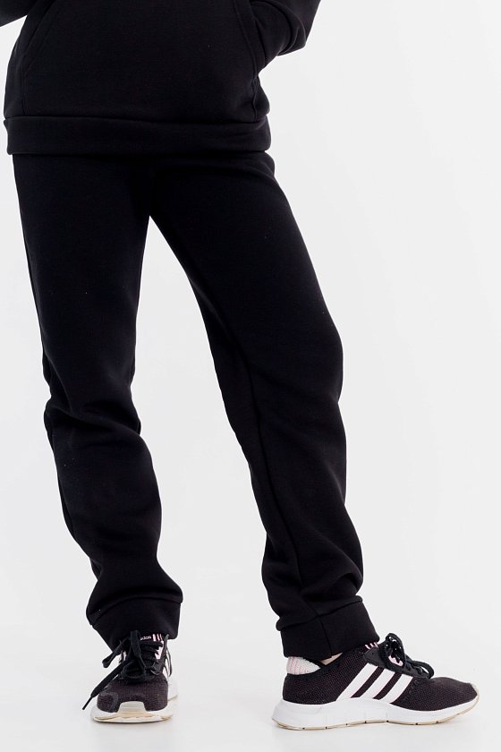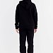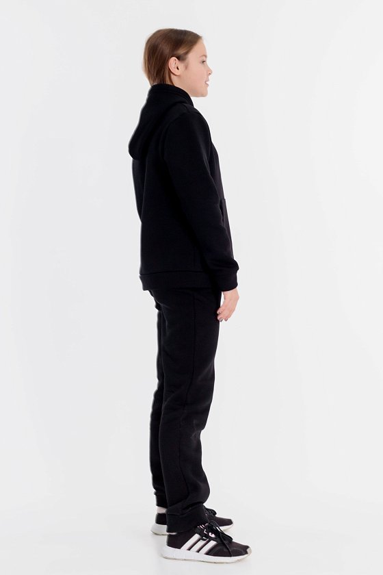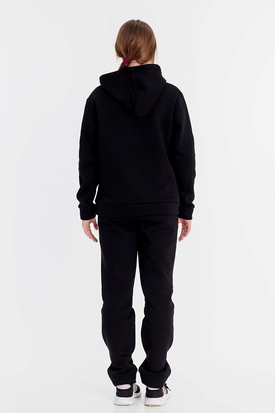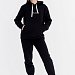 Костюм выполнен из футера с начёсом (трёхнитка), состоит из толстовки и брюк. Толстовка с капюшоном, карманом-кенгуру и принтом спереди. Пояс толстовки, низ рукавов и низ брюк оформлены манжетами из основного полотна. Пояс брюк на резине и шнуре.