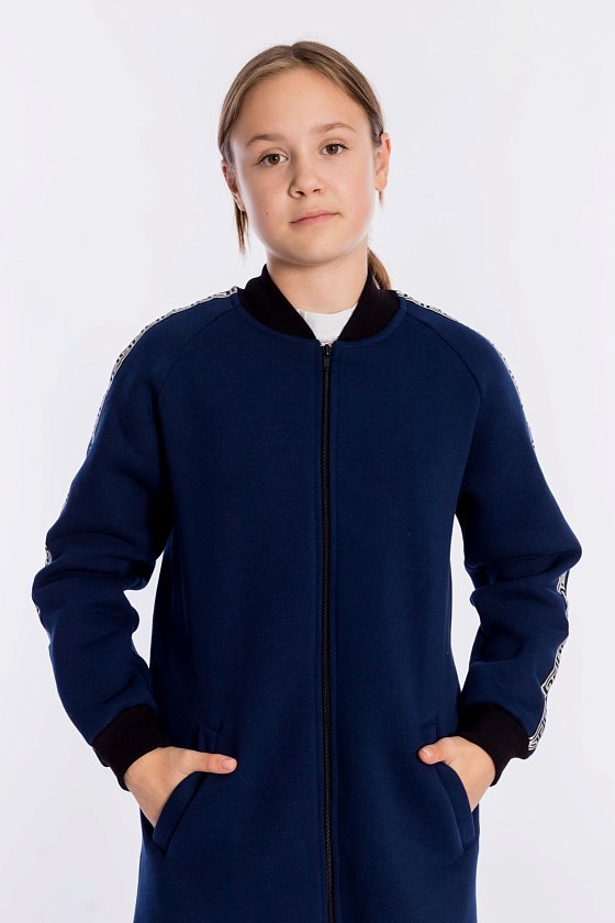 Кардиган выполнен из полотна с начёсом. Спереди застёжка на молнию, по бокам прорезные карманы. Рукава покроя реглан, по линии швов настрочена киперная тесьма.
