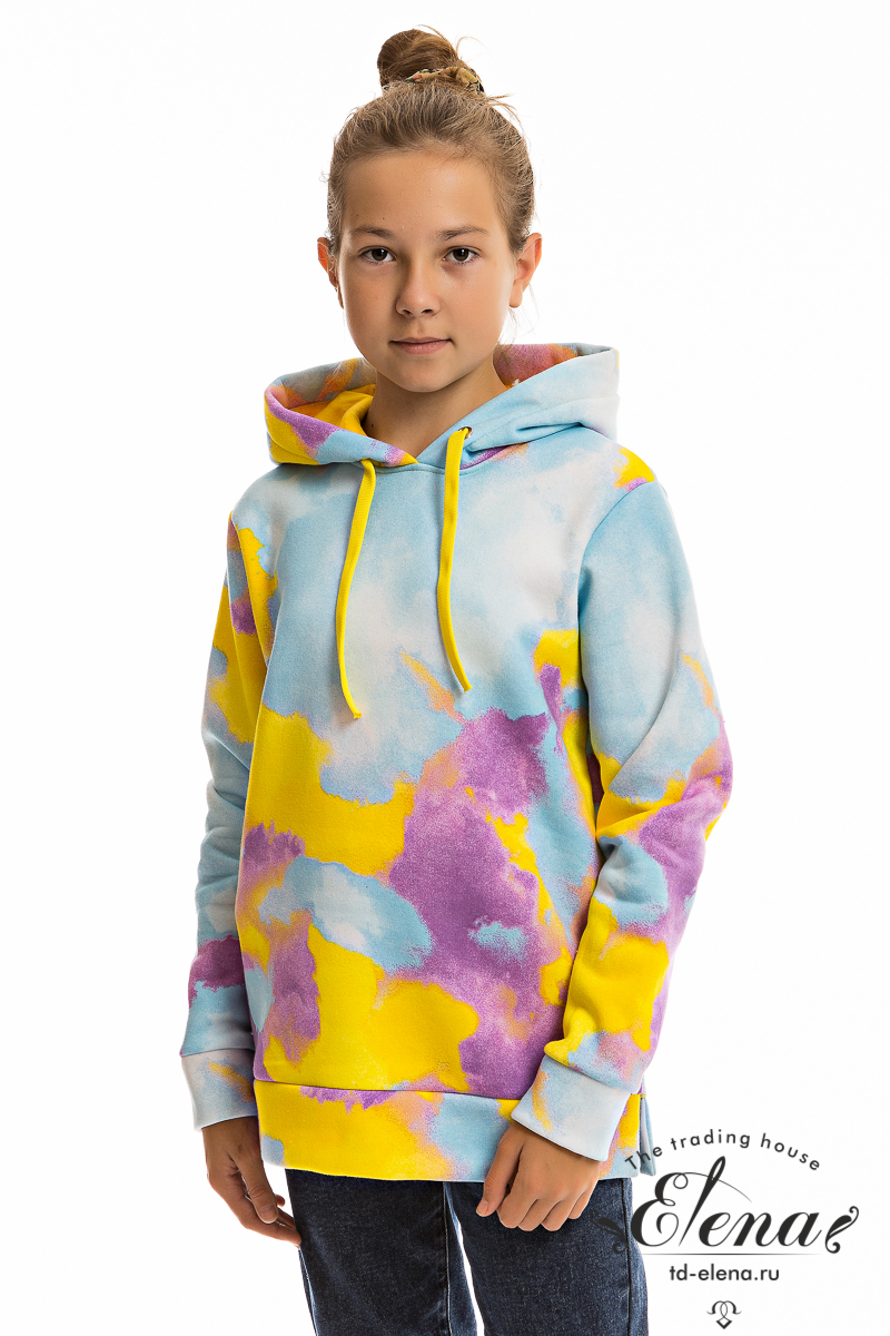 Толстовка выполнена из трикотажного полотна с начёсом (футер трёхнитка). Длинный шнурок регулирует объём капюшона, рукава с притачными манжетами. В боковых швах сделаны декоративные разрезы. Толстовка идеально подойдёт под спортивный, повседневный стиль в одежде.