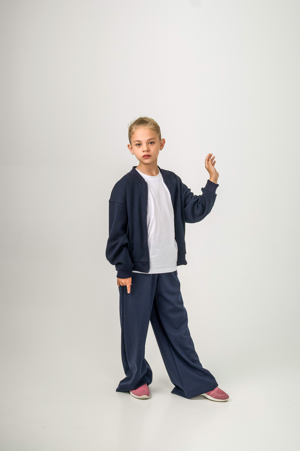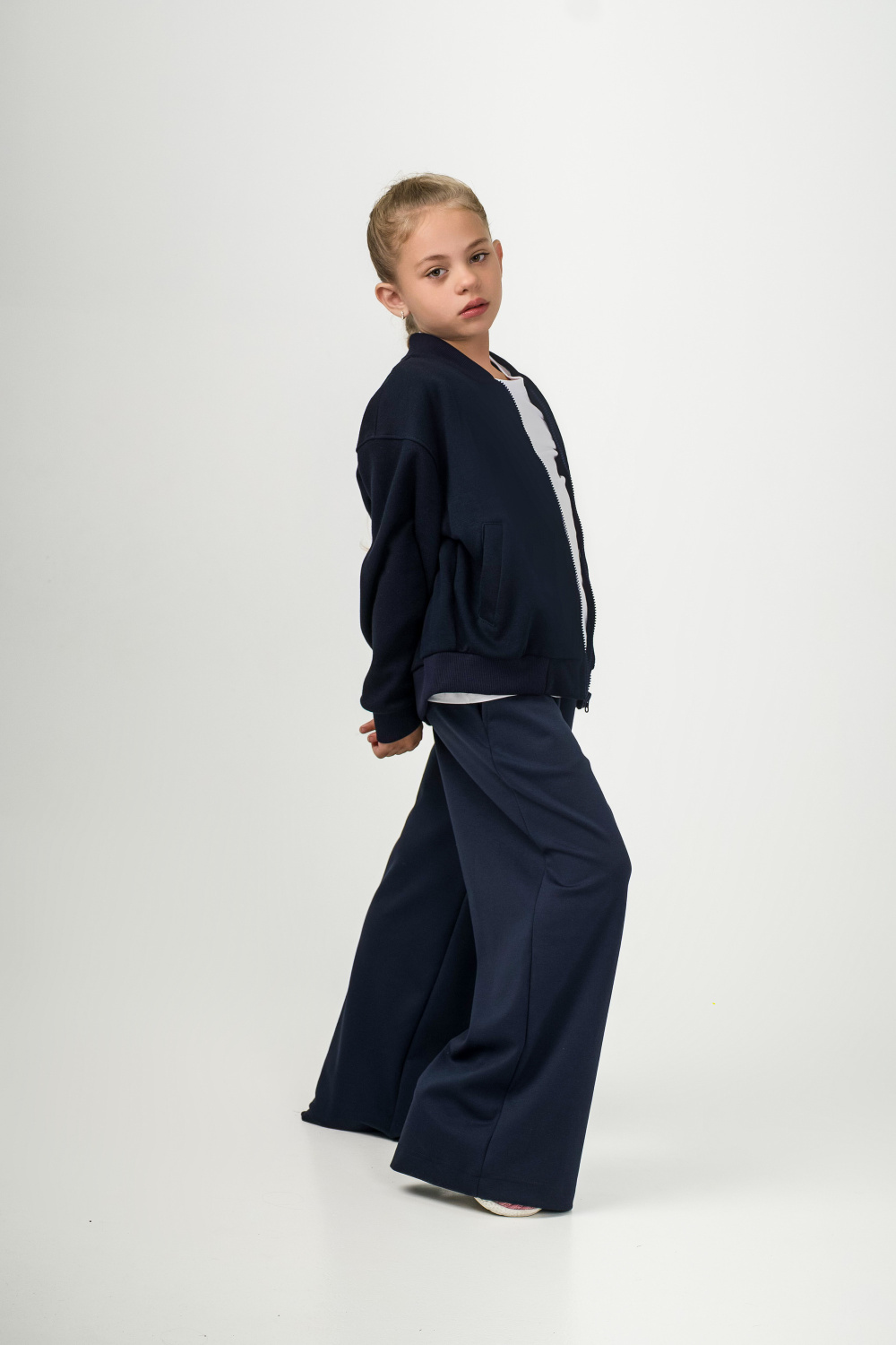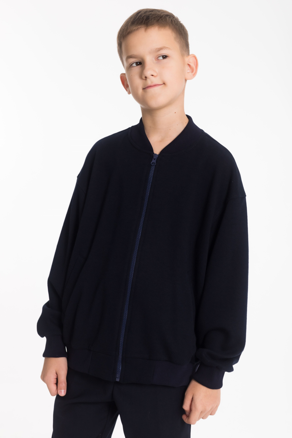 Удобная и стильная детская толстовка-бомбер выполнена из мягкого трикотажного полотна (силаник). Застегивается на молнию, дополнена карманами-листочками. Пояс, манжеты и воротник выполнены из кашкорсе, что обеспечивает комфортную посадку и долговечность. Практичная модель, которая отлично подойдёт для школы, прогулок и повседневной носки.