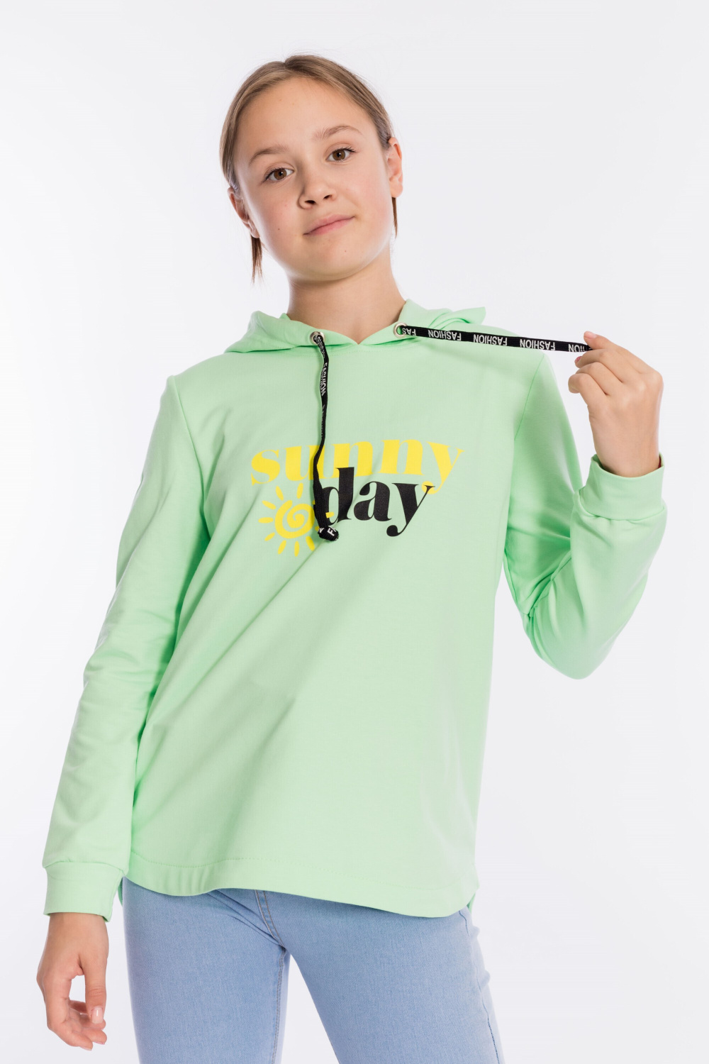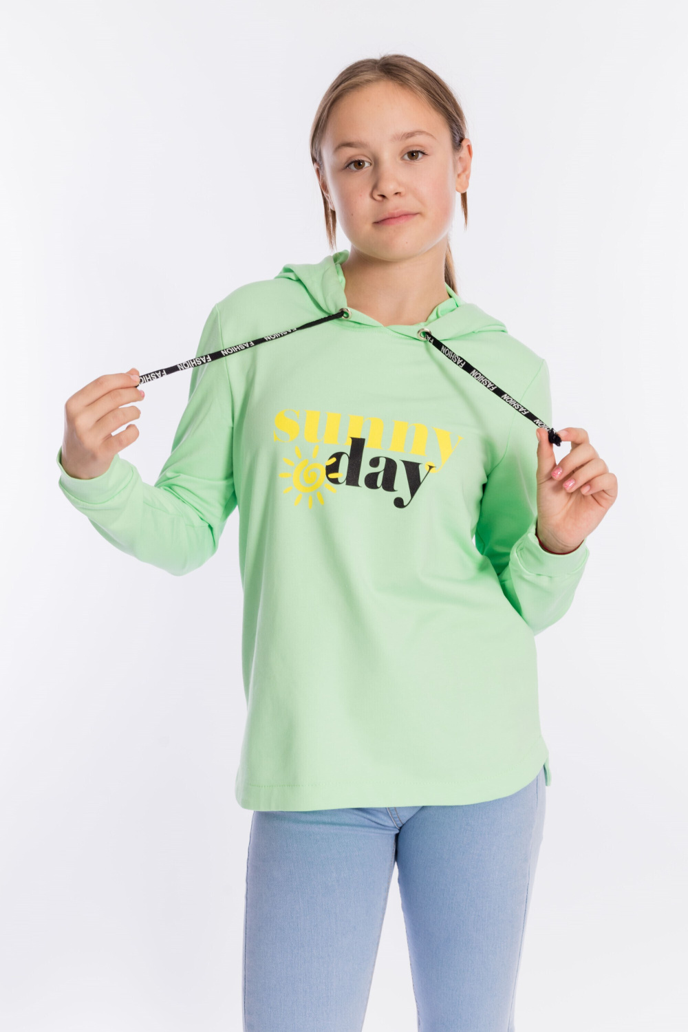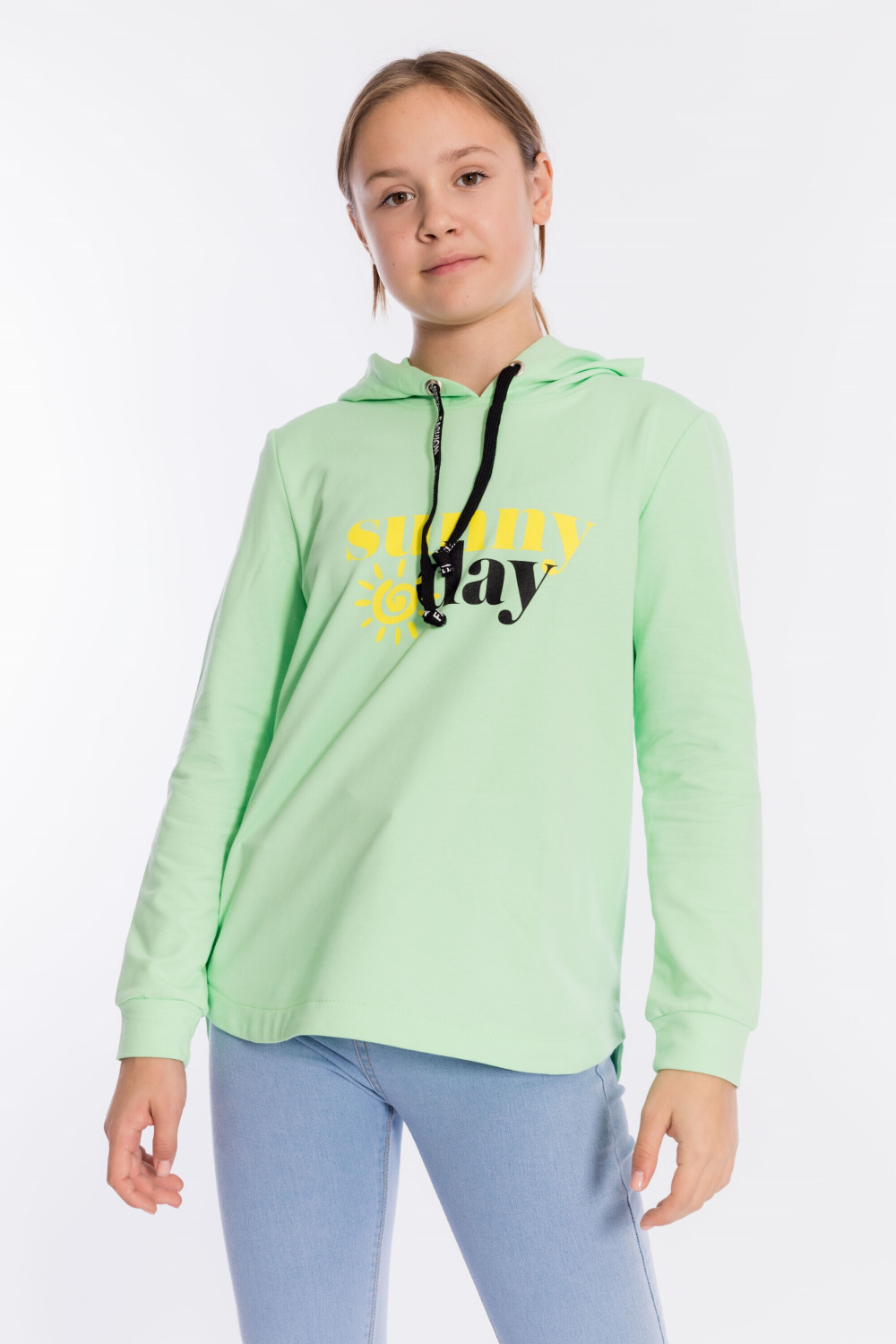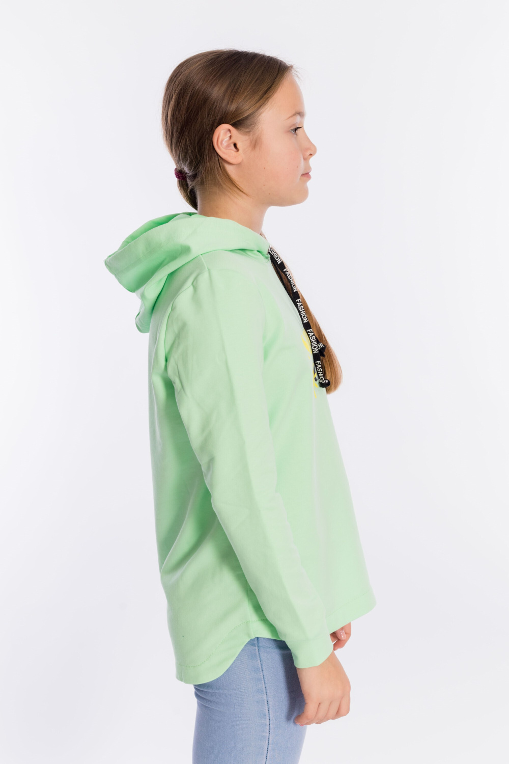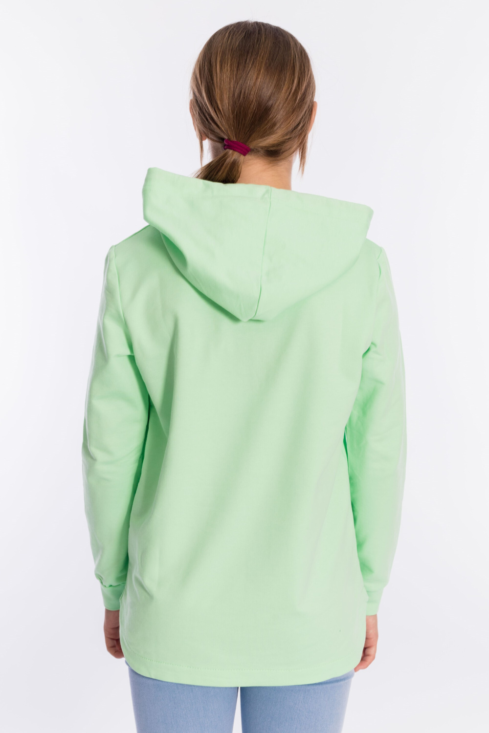 Толстовка для девочек с капюшоном из однотонного футера с лайкрой сочетает комфорт, стиль и оригинальный дизайн.