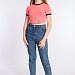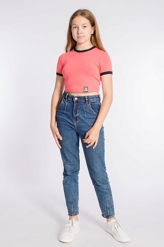 Укороченная футболка выполнена из однотонной кулирки с лайкрой. Планки коротких рукавов и круглого выреза горловины из полотна отделочного цвета, спереди декоративная нашивка.