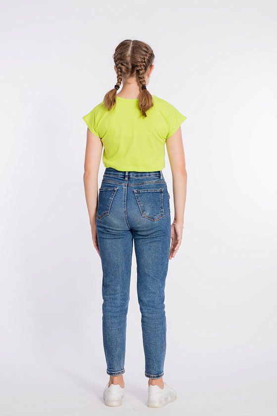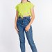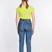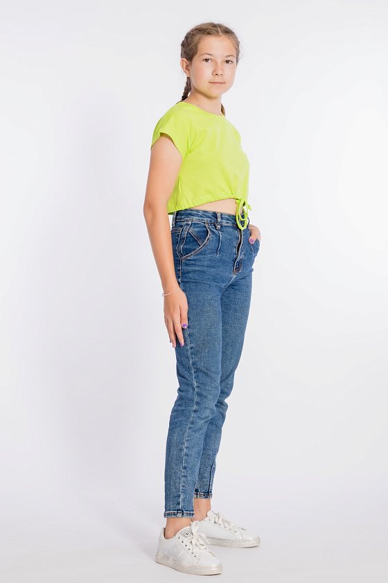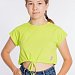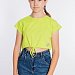 Короткий топ из однотонной кулирки со спущенной линией плеча. С кулиской по низу и термопринтом.