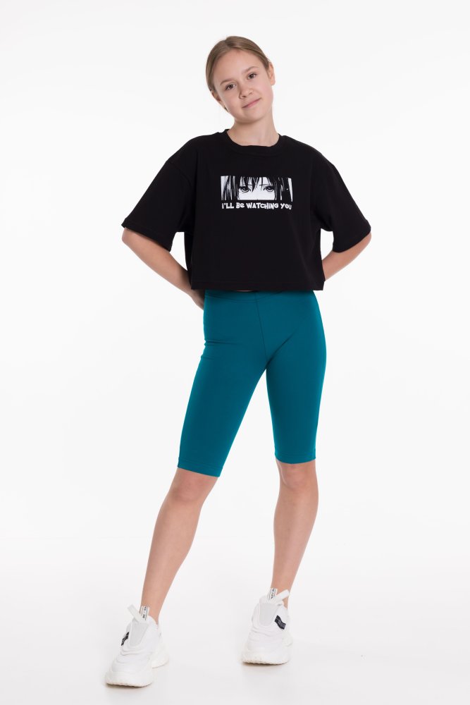 Велосипедки выполнены из хлопкового полотна с добавлением лайкры. Внизу, по бокам небольшие разрезы, пояс на резинке.