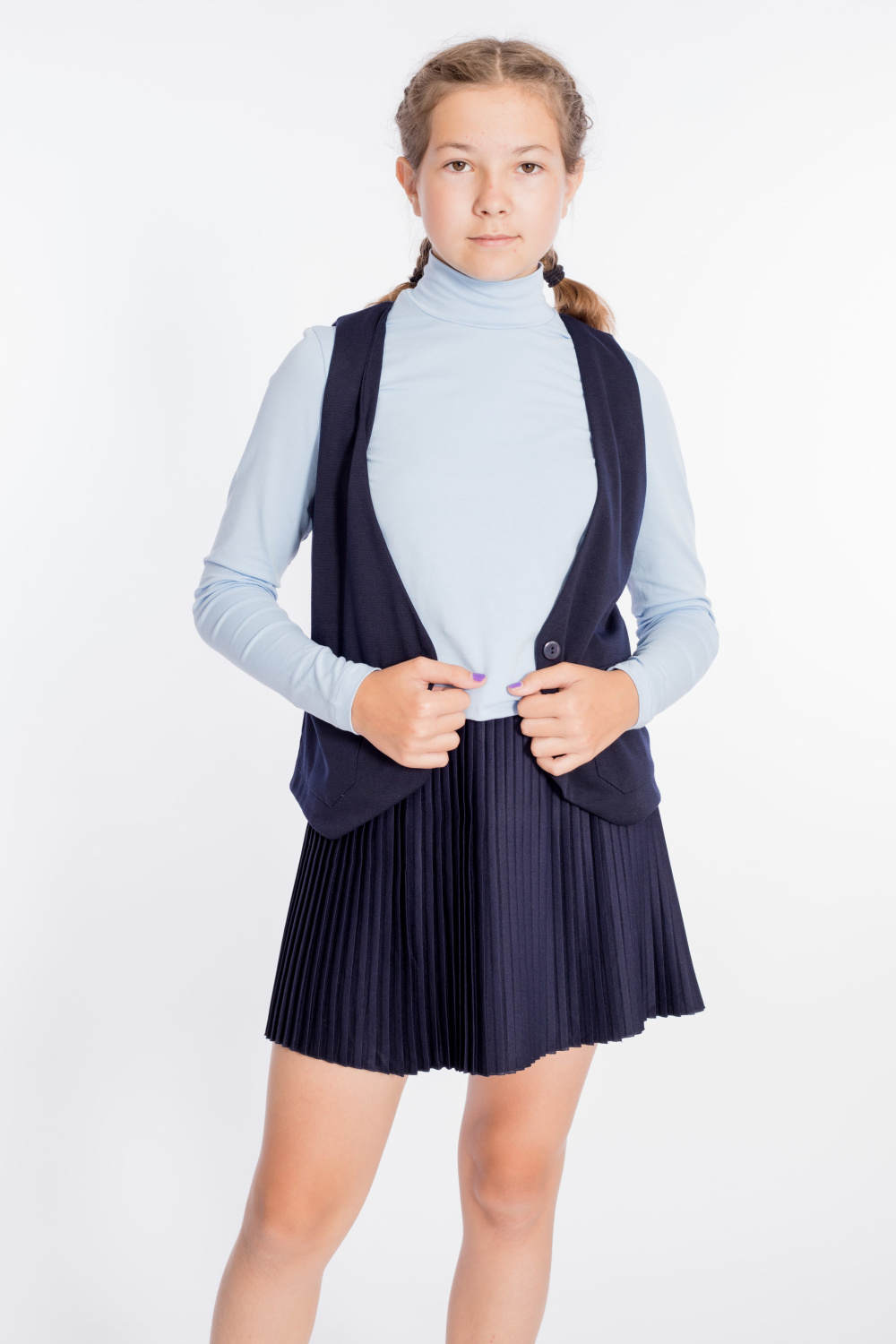 Стильный трикотажный жилет, незаменимый вариант школьной одежды на каждый день. Жилет выполнен из академика. V-образный вырез горловины, спереди застёжка на пуговицы и два накладных кармана.
