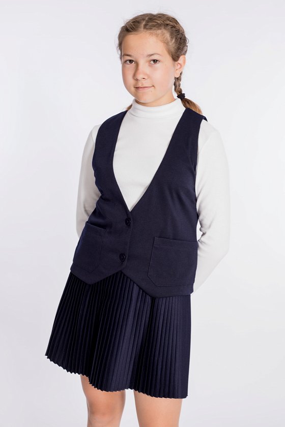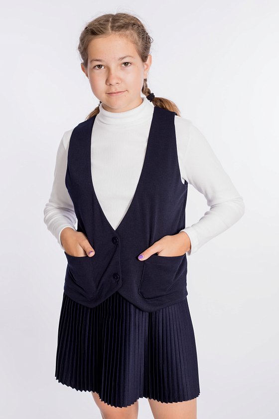 Стильный трикотажный жилет, незаменимый вариант школьной одежды на каждый день. Жилет выполнен из академика. V-образный вырез горловины, спереди застёжка на пуговицы и два накладных кармана.