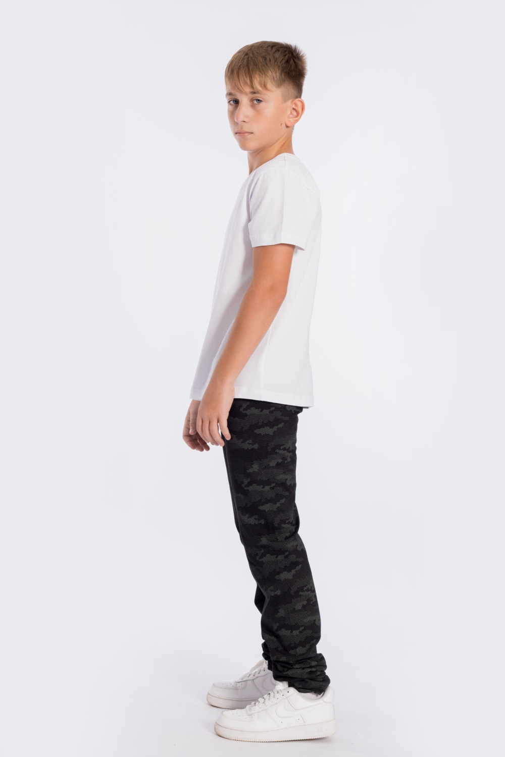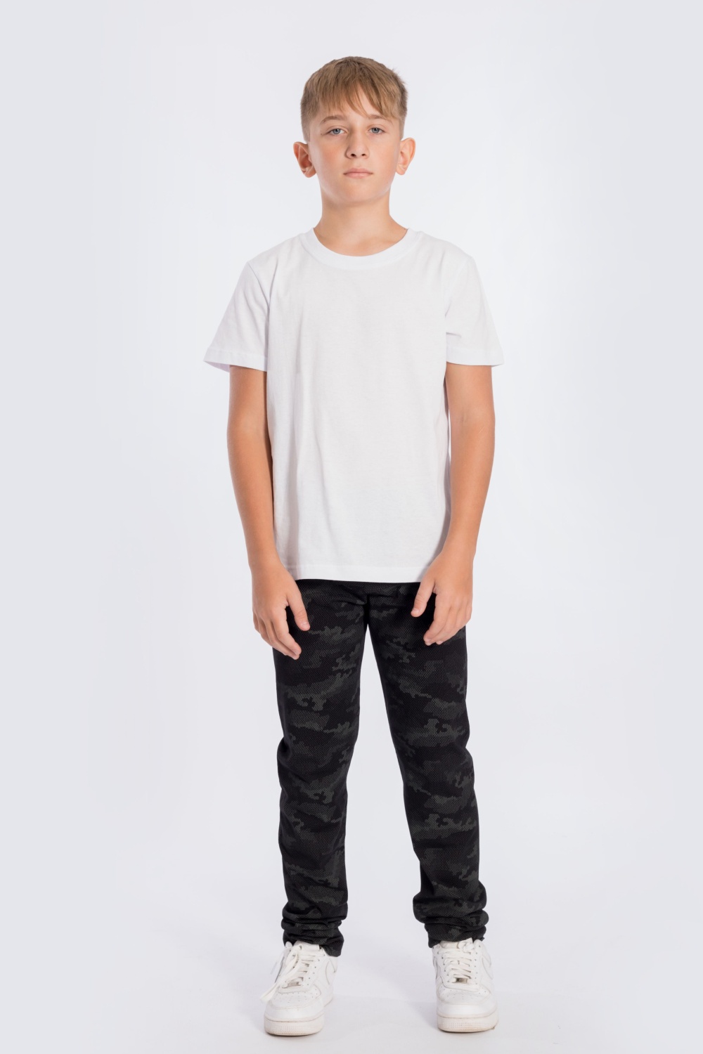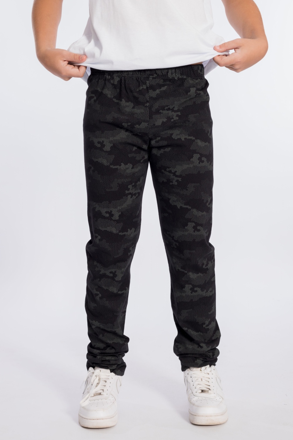 Брюки выполнены из кулирки, 100% хлопок (набивка камуфляж). Брюки без боковых швов, на резине по поясу.