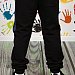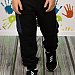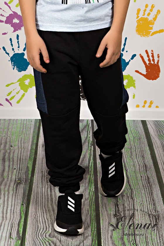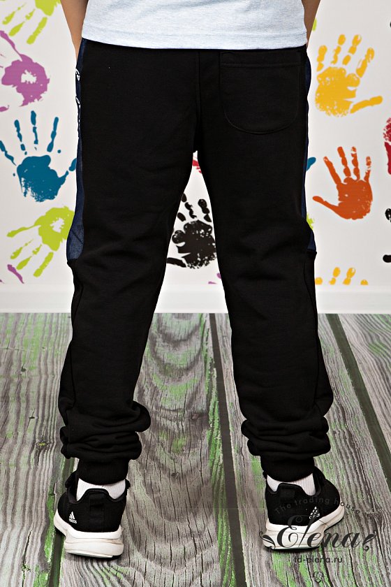 Брюки из однотонного футера-воздушки с деталями из джинсовой ткани и манжетами из кашкорсе. Пояс на резине, через термолюверсы в качестве декора вставлен шнур. Сзади посередине настрочена декоративная тесьма. По бокам размещены карманы, сзади кокетка и накладной карман.