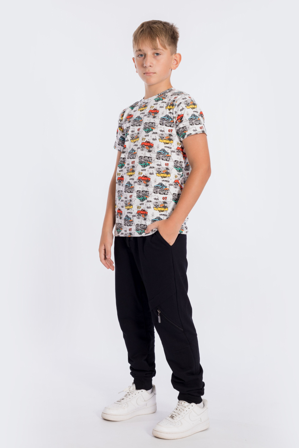 Брюки выполнены из футера двухнитки. Пояс на резине и шнуре, по бокам расположены карманы. Брюки оригинального кроя и с декоративным элементом в виде молнии с левой стороны. Низ брюк с манжетами из кашкорсе.