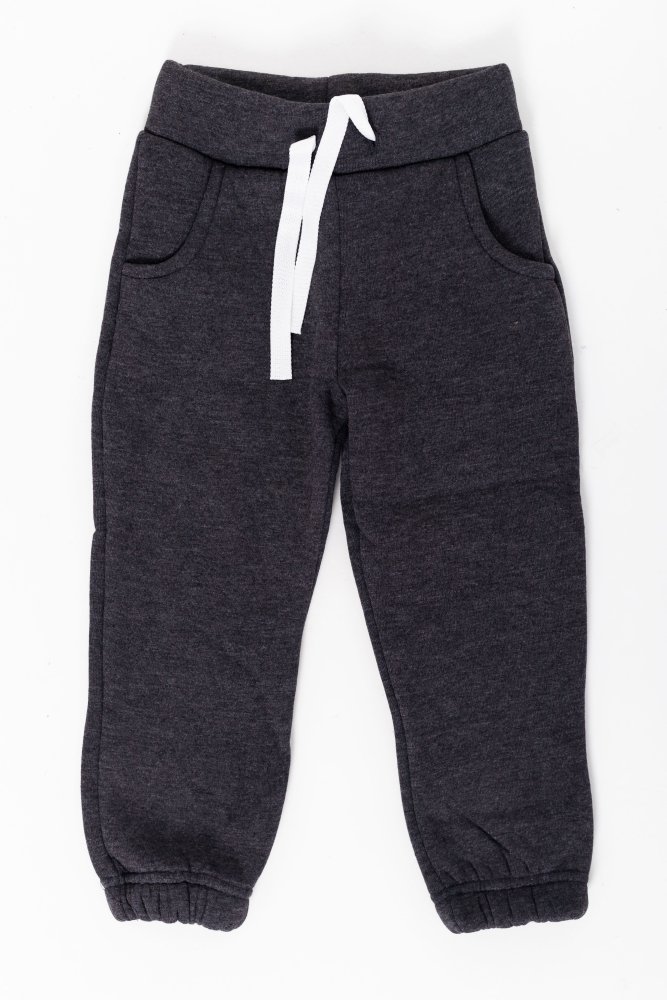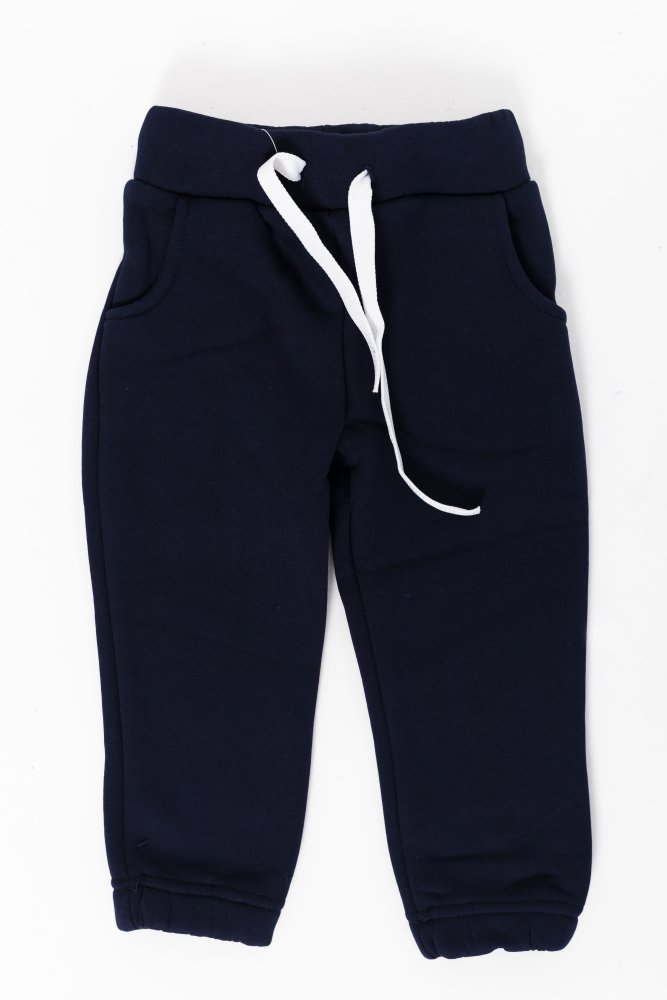 Брюки выполнены из футера с добавлением лайкры. С притачным поясом и манжетами из кашкорсе. Пояс с широкой резиной, через люверсы проложен шнур. Покрой брюк с отделочными уголками, которые образуют ромб по бокам брючин. По бокам размещены наклонные, прорезные карманы, с левой стороны вышивка.